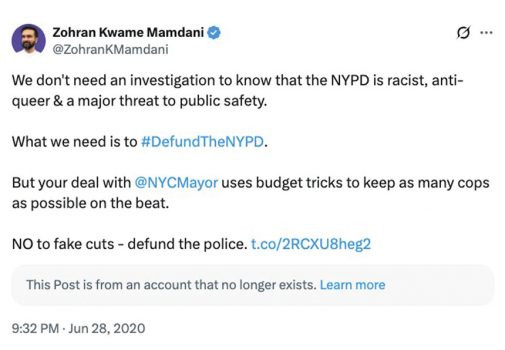綜合《紐約郵報》及《每日新聞》報道,2020年6月,尚未當選皇后區西部(Western Queens)州眾議員的馬姆達尼在網上發文,「無需調查即知市警種族主義、反酷兒,是公共安全重大威脅,應削減其經費。」自競選市長以來,他與該言論保持距離,承諾不削減市警經費,而是維持現有資金,並計劃創建新機構接手精神健康呼叫,減輕警員負擔。