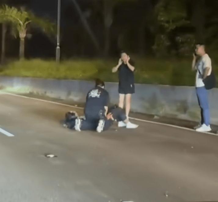 從網上影片可見,鐵騎士頭部被墊起,躺卧路中快線,至少有一名市民為他處理傷熱,另有一名女士在打電話,疑似協助報案。fb「車cam L(香港群組)」