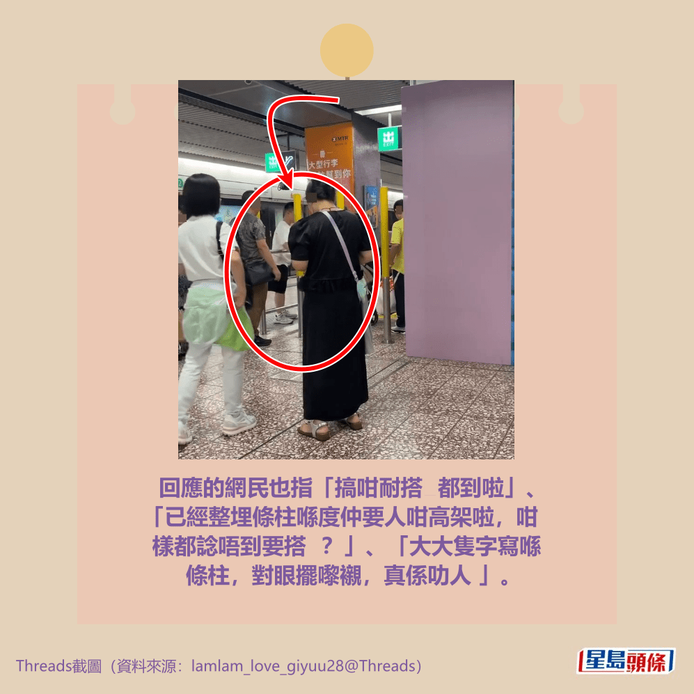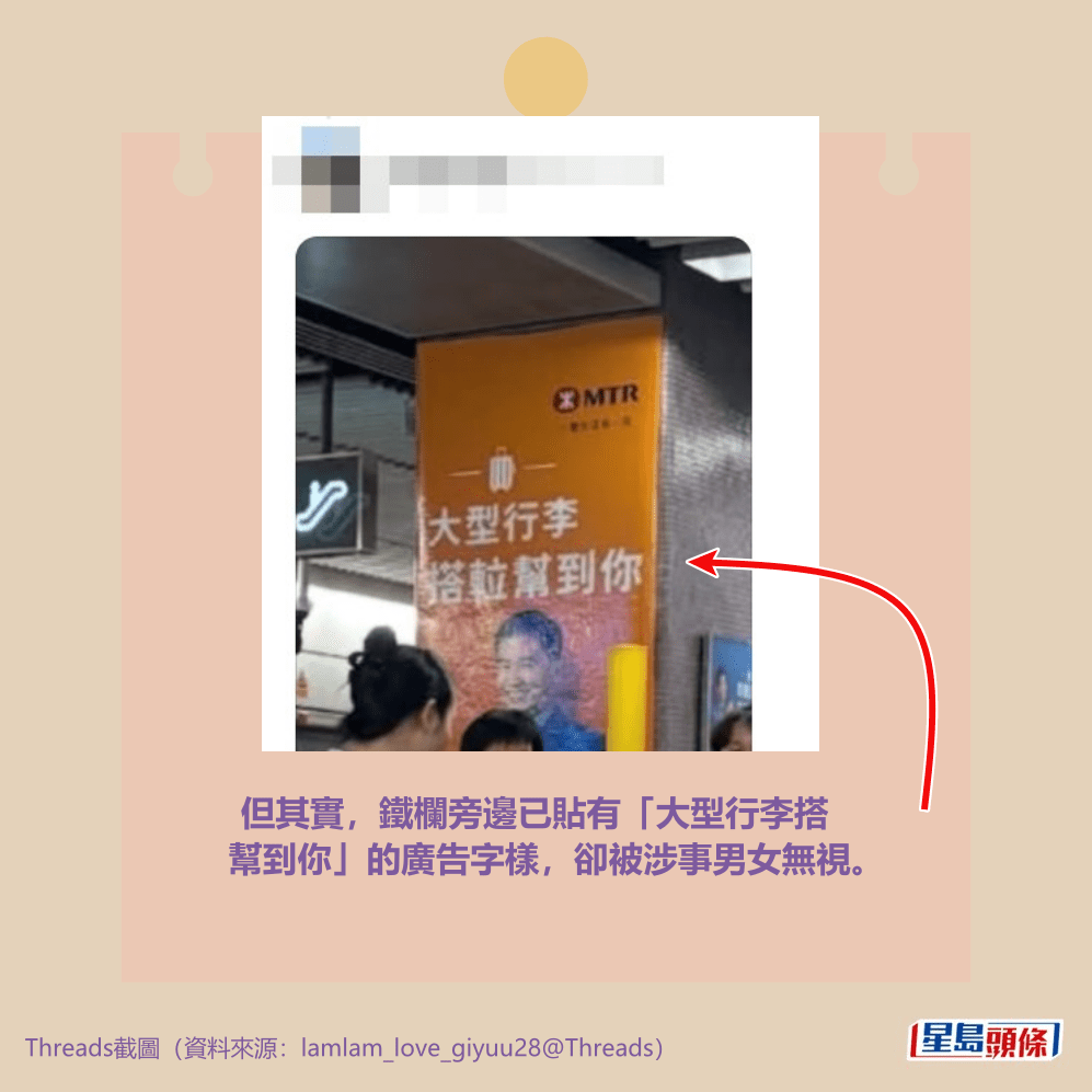 但其實,鐵欄旁邊已貼有「大型行李搭𨋢幫到你」的廣告字樣,卻被涉事男女無視。回應的網民也指「搞咁耐搭𨋢都到啦」、「已經整埋條柱喺度仲要人咁高架啦,咁樣都諗唔到要搭𨋢?」、「(廣告)大大隻字寫喺條柱,對眼擺嚟襯,真係叻人 」。