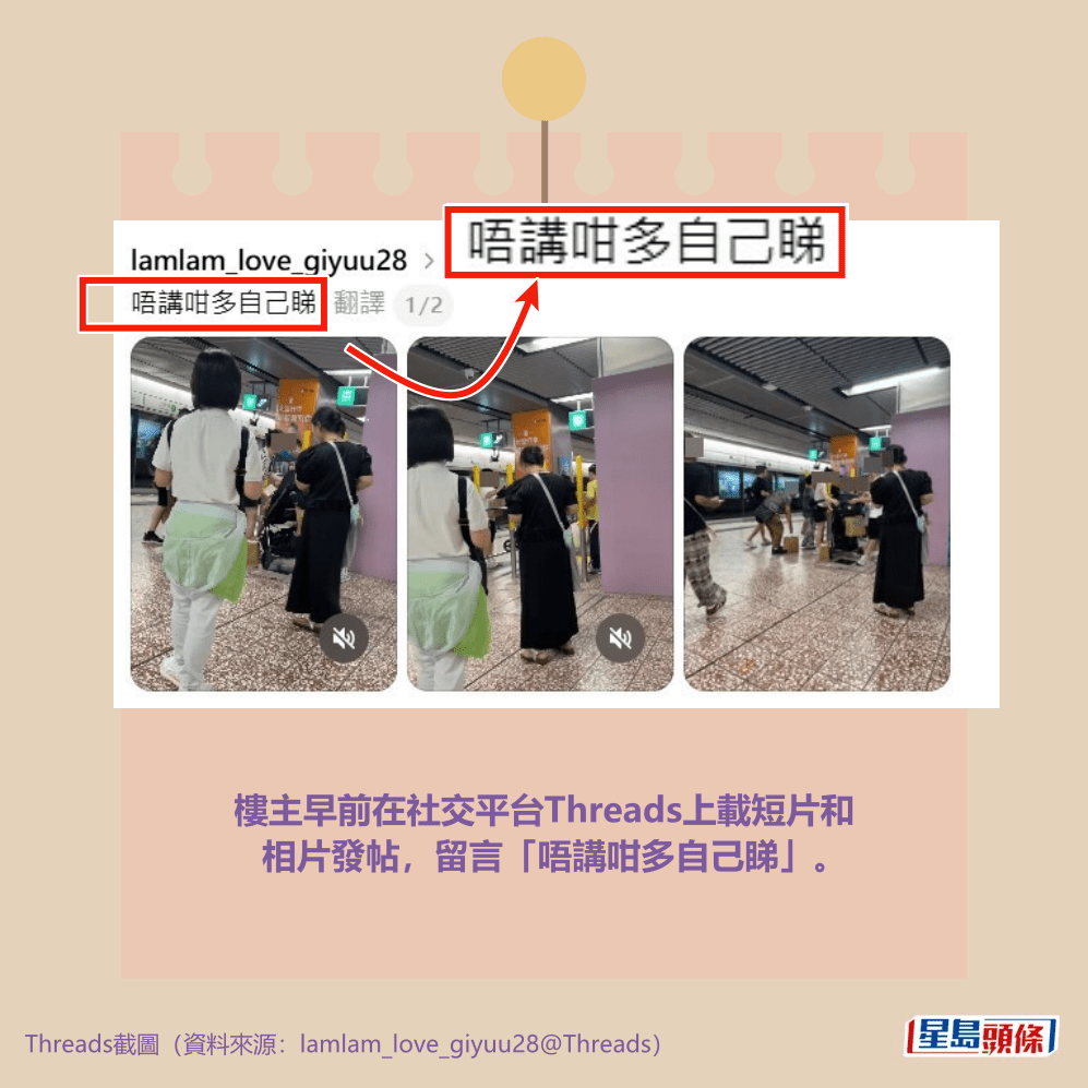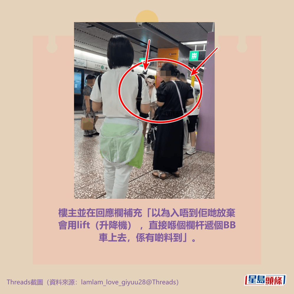 樓主早前在社交平台Threads上載短片和相片發帖,留言「唔講咁多自己睇」,並在回應欄補充「以為入唔到佢哋放棄會用lift(升降機) ,直接喺個欄杆遞個BB車上去,係有啲料到」。