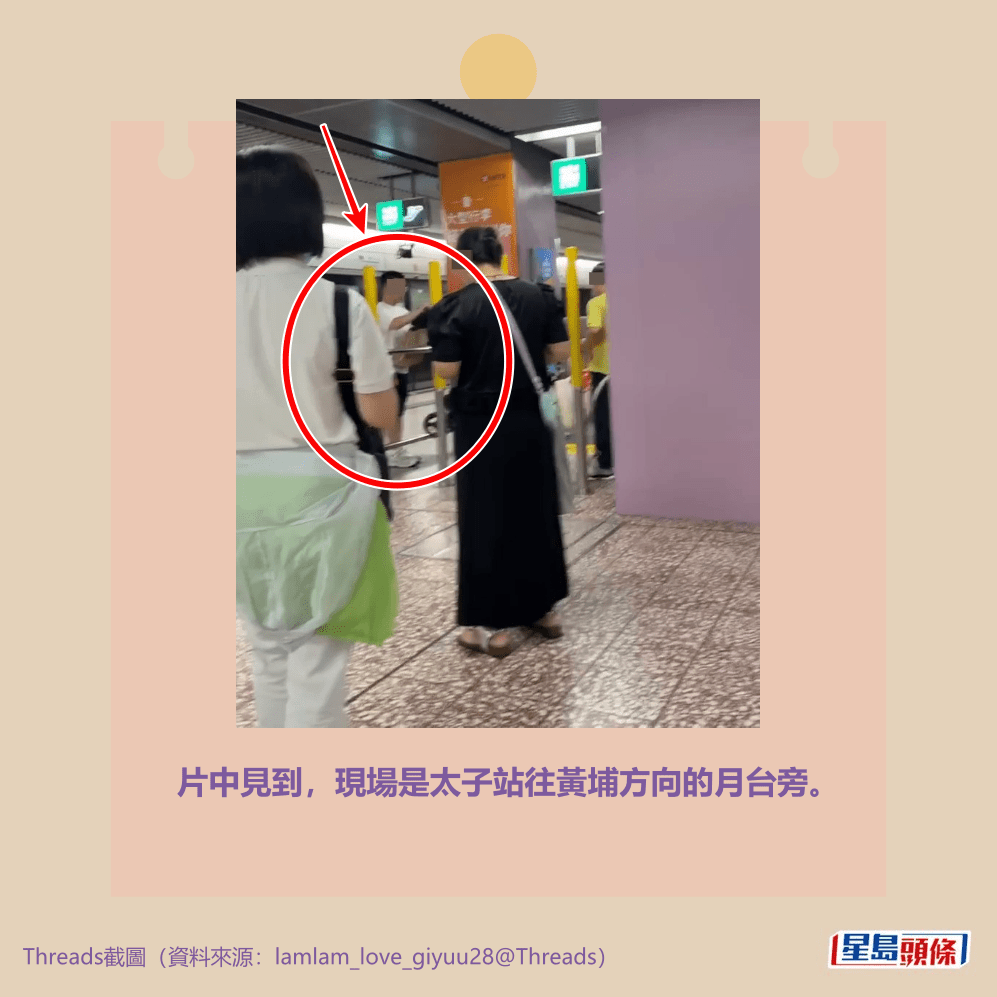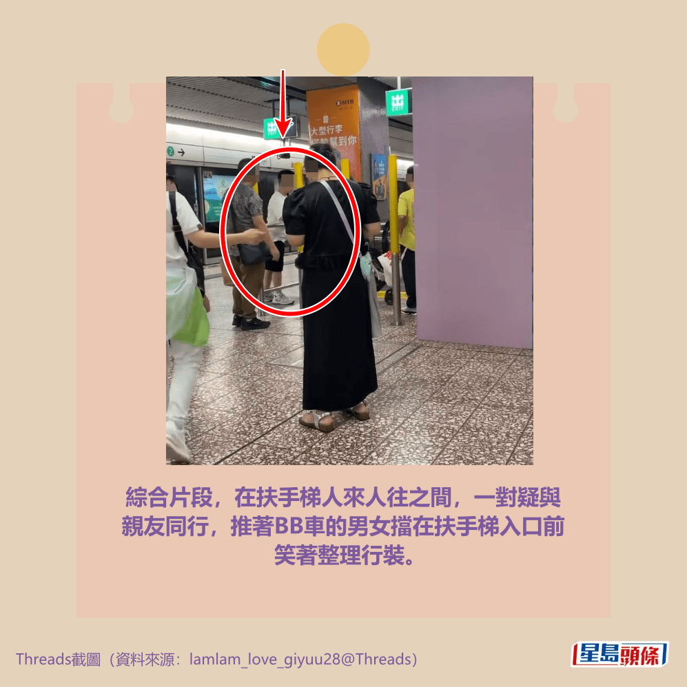 片中見到,現場是太子站往黃埔方向的月台旁。綜合片段,在扶手梯人來人往之間,一對疑與親友同行,推著BB車的男女擋在扶手梯入口前笑著整理行裝。