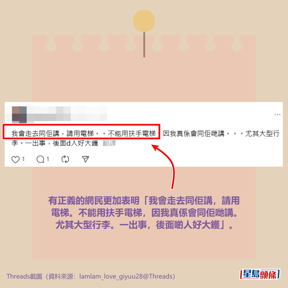 有正義的網民更加表明「我會走去同佢講,請用電梯。不能用扶手電梯,因我真係會同佢哋講。尤其大型行李。一出事,後面啲人好大鑊」。