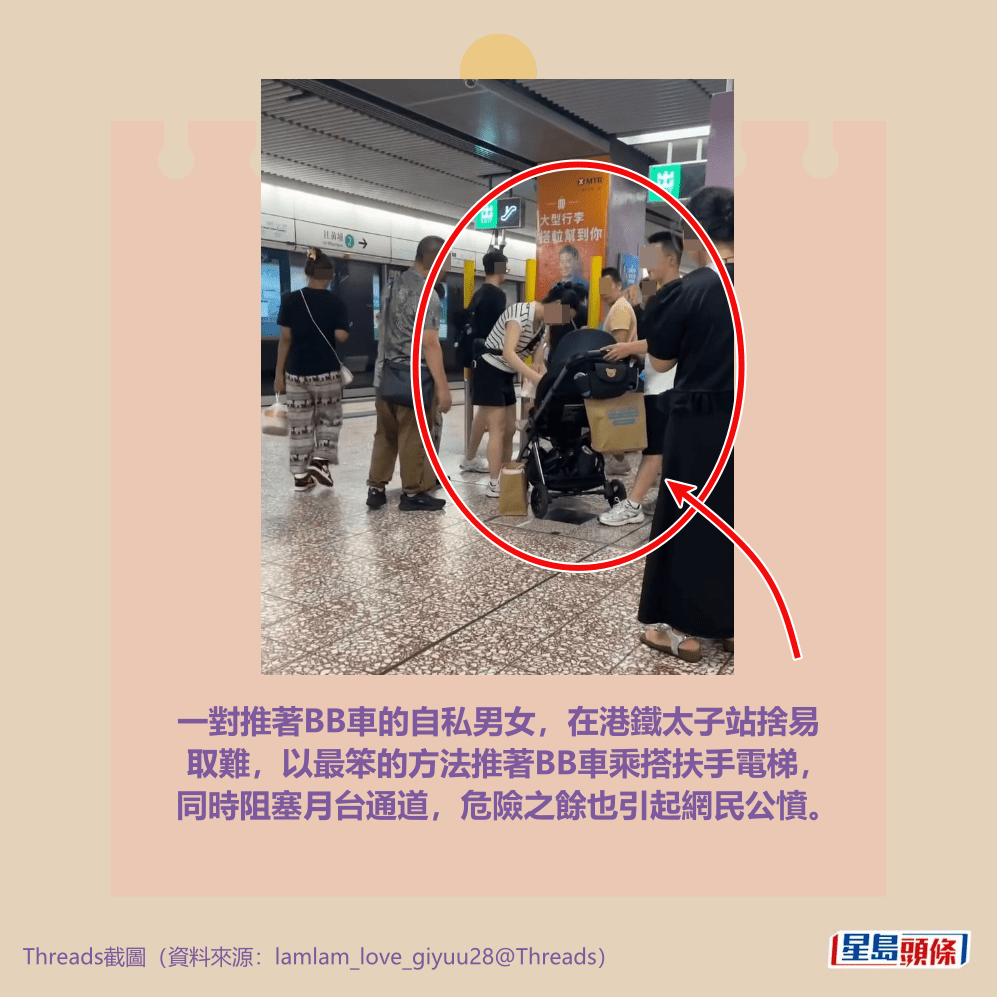 一對推著BB車的自私男女,在港鐵太子站捨易取難,以最笨的方法推著BB車乘搭扶手電梯,同時阻塞月台通道,危險之餘也引起網民公憤。詳情見下圖及下文: