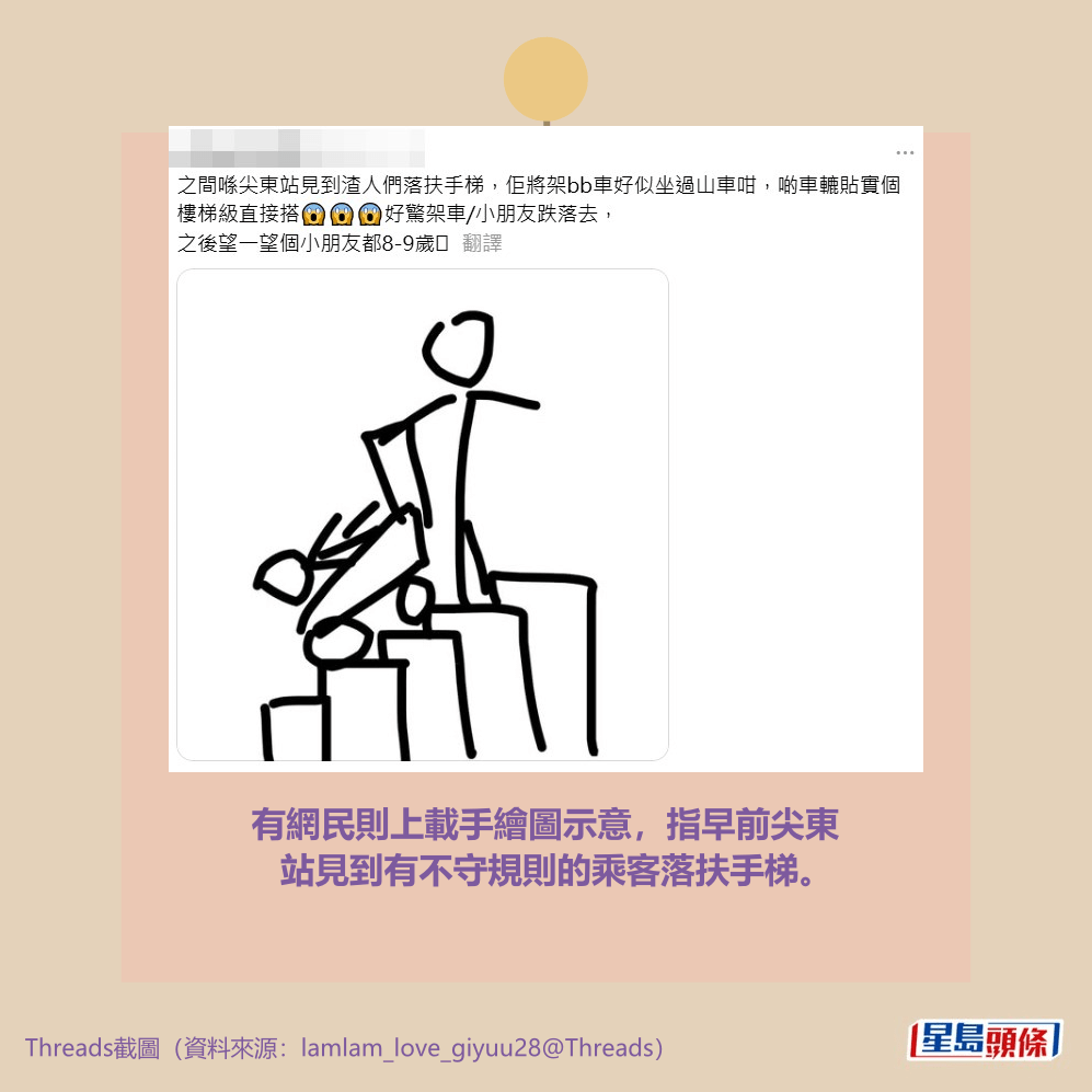 有網民則上載手繪圖示意,指早前尖東站見到有不守規則的乘客落扶手梯,「將架BB車好似坐過山車咁,啲車轆貼實個樓梯級直接搭,好驚架車/小朋友跌落去,之後望一望個小朋友都8-9歲」,另有人附和稱「上星期尖沙咀站都見到!兩個都8-10歲仲要坐BB車搭扶手電梯,差啲成部連人帶車飛出去」。
