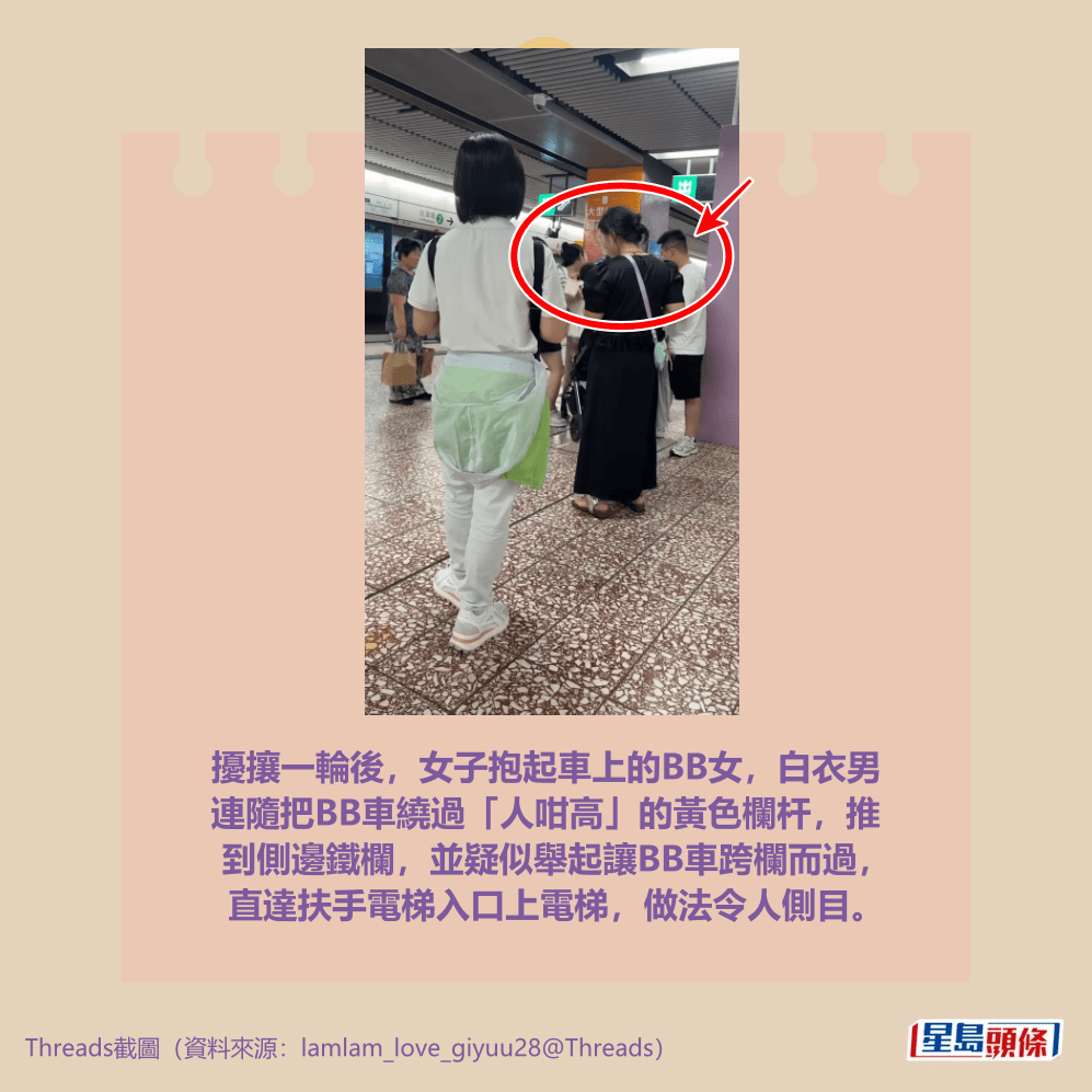 擾攘一輪後,女子抱起車上的BB女,白衣男連隨把BB車繞過「人咁高」的黃色欄杆,推到側邊鐵欄,並疑似舉起讓BB車跨欄而過,直達扶手電梯入口上電梯,做法令人側目。