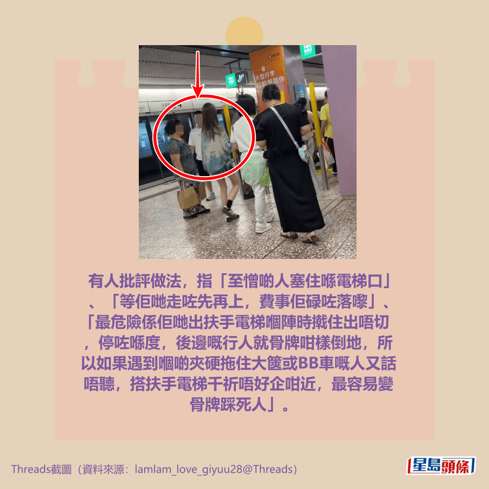 有人批評做法,指「至憎啲人塞住喺電梯口」、「等佢哋走咗先再上,費事佢碌咗落嚟」、「最危險係佢哋出扶手電梯嗰陣時撠住出唔切,停咗喺度,後邊嘅行人就骨牌咁樣倒地,所以如果遇到嗰啲夾硬拖住大篋或BB車嘅人又話唔聽,搭扶手電梯千祈唔好企咁近,最容易變骨牌踩死人」。