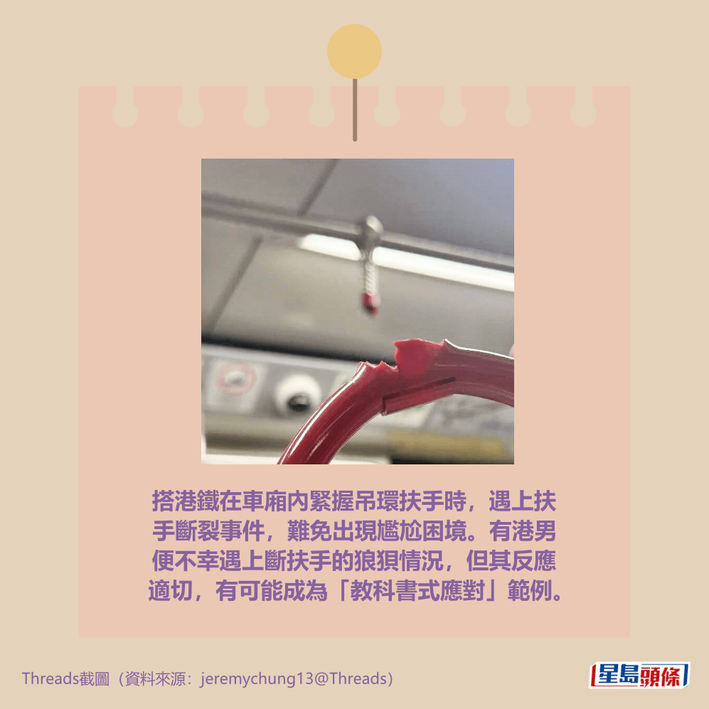 搭港鐵在車廂內緊握吊環扶手時,遇上扶手斷裂事件,難免出現尷尬困境。有港男便不幸遇上斷扶手的狼狽情況,但其反應適切,有可能成為「教科書式應對」範例;而職員就事件的反應也備受網民關注。詳情見下圖及下文: