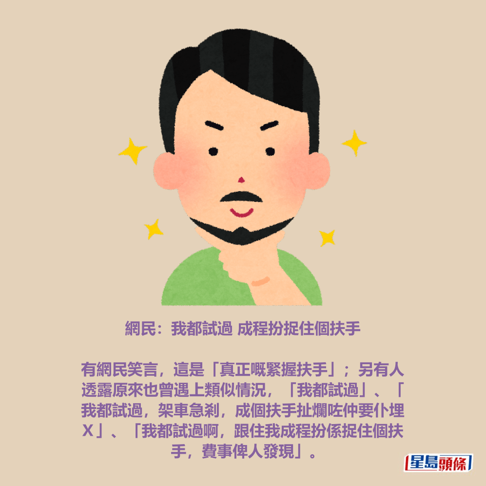 有網民笑言,這是「真正嘅緊握扶手」;另有人透露原來也曾遇上類似情況,「我都試過」、「我都試過,架車急剎,成個扶手扯爛咗仲要仆埋X」、「我都試過啊,跟住我成程扮係捉住個扶手,費事俾人發現」。