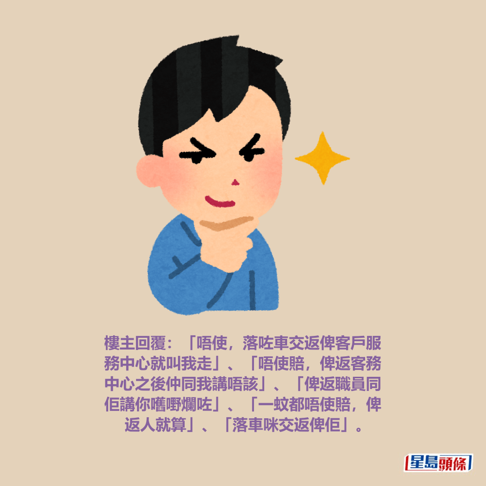 樓主回覆:「唔使,落咗車交返俾客戶服務中心就叫我走」、「唔使賠,俾返客務中心之後仲同我講唔該」、「俾返職員同佢講你嚿嘢爛咗」、「一蚊都唔使賠,俾返人就算」、「落車咪交返俾佢」。