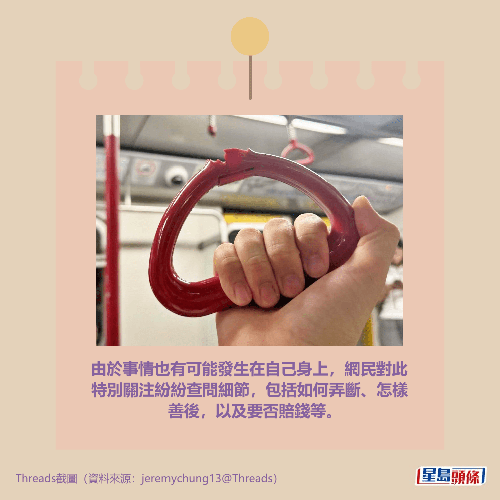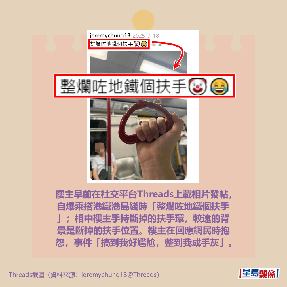 樓主早前在社交平台Threads上載相片發帖,自爆乘搭港鐵港島綫時「整爛咗地鐵個扶手」;相中樓主手持斷掉的扶手環,較遠的背景是斷掉的扶手位置。樓主在回應網民時抱怨,事件「搞到我好尷尬,整到我成手灰」。