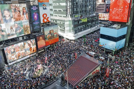 18日逾10萬名抗議者參與紐約市「不要國王」(No Kings)大遊行,從時報廣場出發,穿越曼哈頓中城直達聯合廣場,強烈要求特朗普政府結束其專制政策。抗議者手持標語如「無國王讓世界更美好」及「特朗普是叛徒」,數個街區長龍蜿蜒前行。空中鏡頭顯示,抗議者高喊口號,譴責特朗普的移民強硬立場及聯邦干預。