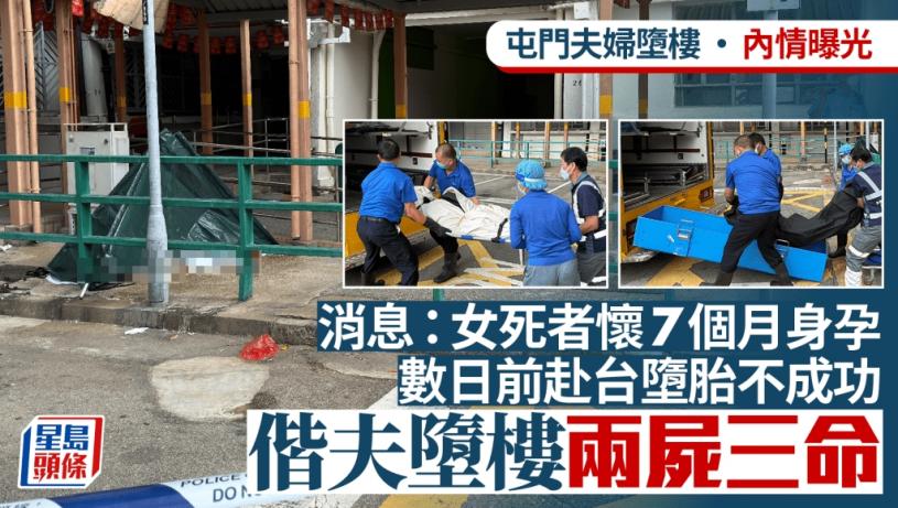 屯門一對夫婦周日(19日)凌晨從大興邨的寓所一躍而下,當場證實不治。消息指,34歲姓陳女死者有大約7個月身孕,她與丈夫因經濟困難而決定墮胎,惟香港醫生拒絕要求,二人上周前往台灣墮胎,但同樣未能進行手術。二人返回香港,將個人物品交給家人後,便返回寓所輕生,釀成兩屍三命慘劇。
