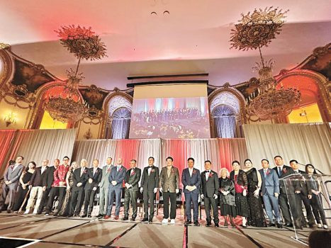 芝城華商會第42屆年會,會長李建明(右11)、董事長倪舉淩(右12)及董事局成員在台上向嘉賓們致意。 梁敏育攝
