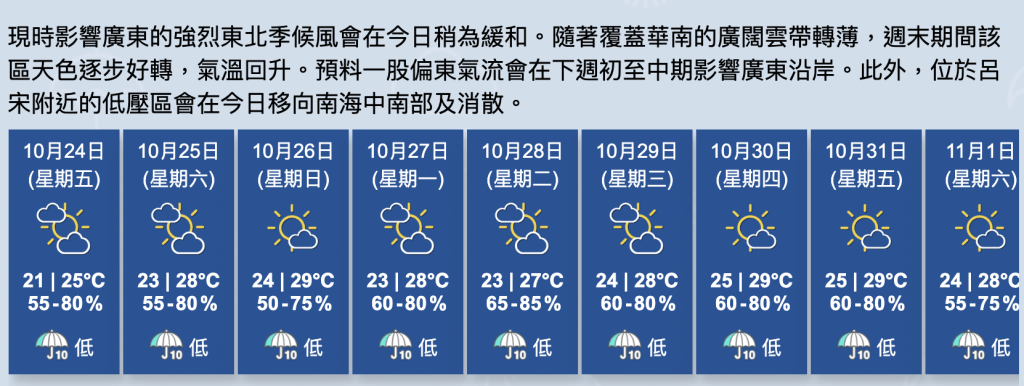本港地區今日大致多雲,早晚有一兩陣微雨。日間部分時間天色明朗,最高氣溫約25度。吹和緩至清勁北至東北風,初時離岸吹強風。