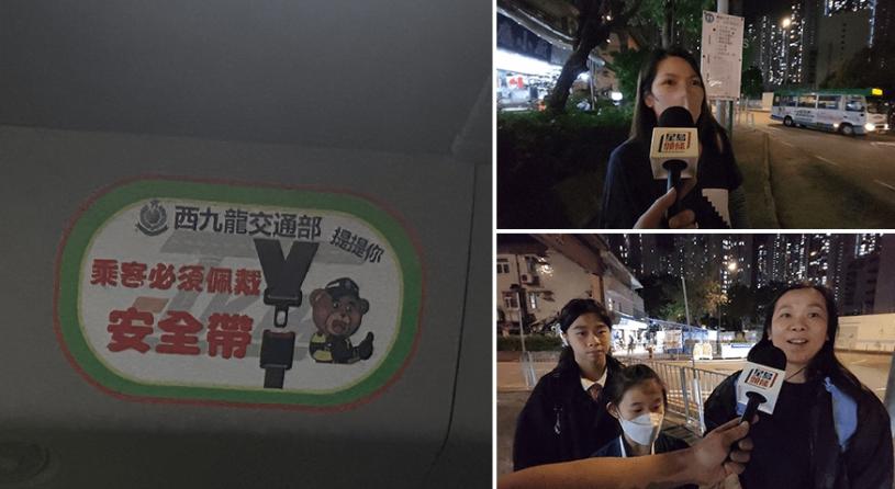 《星島頭條》晚上到坑口村了解,見到大部份11號小巴車內均貼有「西九龍交通部提提你 乘客必須佩戴安全帶」的貼紙。市民梅小姐表示,平日司機甚少提醒乘客要戴安全帶,僅見車上面貼有標語。她指平日眼見九成乘客都不會主動佩戴,但她為顧及自身安全,每次搭小巴一定會戴,「好多時有啲人中途上車就好趕,搭一兩個站就落車,變咗就唔會alert,如果係一個守法嘅市民,就一定要戴安全帶,如果真係執法人員上車執法,都會有佢地嘅原因,可能呢排多交通意外?」她又表示讚成警方今次的執法,「都係一個善意提醒,如果你放鬆咗,乘客就無咁alert,佢哋就唔會知原來唔戴安全帶,會令自己生命有危險」。