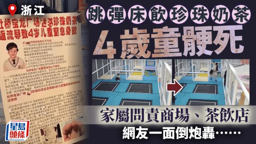 浙江台州一名4歲男童在玩跳彈床期間被珍珠奶茶噎住致窒息而亡,家長事後指控奶茶店、遊樂場運營方、及商場需負上法律責任。