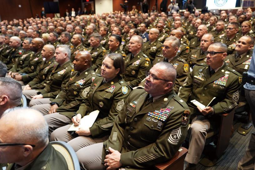 圖為特朗普總統上月在維州海軍陸戰隊基地發表講話,美軍高層在場聆聽。美聯社資料圖片