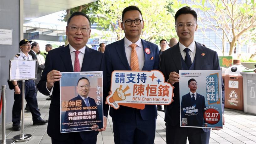 立法會換屆選舉提名期第二日,民建聯現任新界西南議員陳恒鑌、選委界議員陳仲尼及觀塘區委任議員洪錦鉉今早(25日)前往政府總部,報名參選選委會界別。民建聯會務顧問譚耀宗、香港工商總會主席江達可及前運輸及房屋局局長陳帆等人亦到場支持。