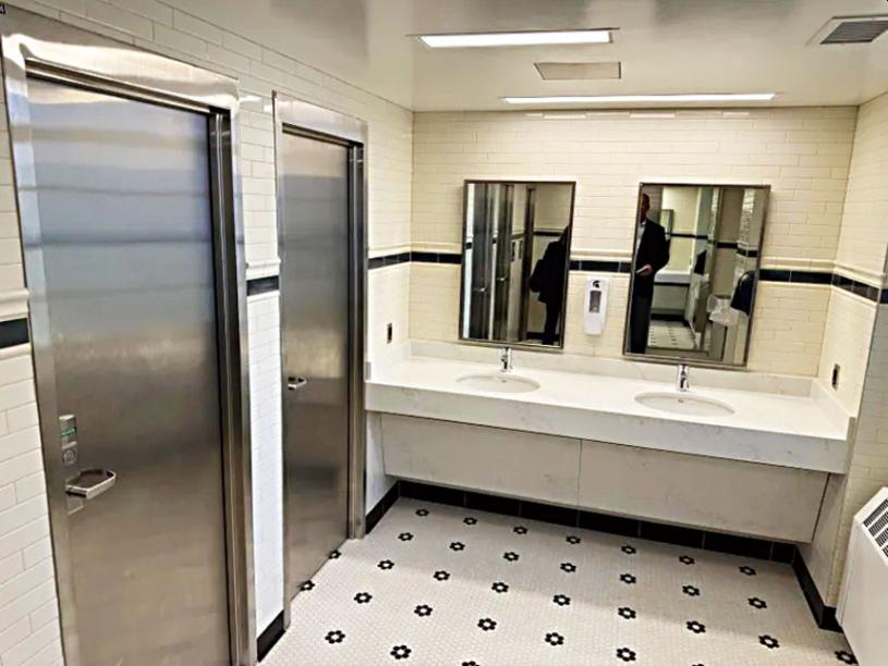 除了翻新窗戶、公共空間與機械設備升級外,宿舍的浴室取消性別分區。如今成為了男女混用的社區空間。單間淋浴間、洗手台與馬桶,皆可男女共享。