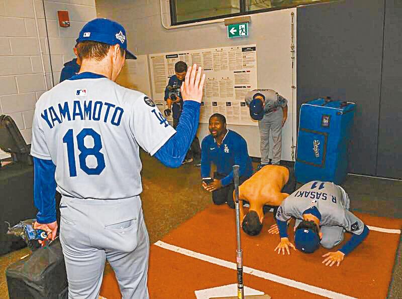 道奇御用攝影師26日在社群曝光賽後花絮照片,只見佐佐木朗希「五體投地」膜拜贏球功臣山本由伸,而周圍的球團人員有人一同跪拜、有人90度鞠躬,紛紛向山本致上最高敬意。
