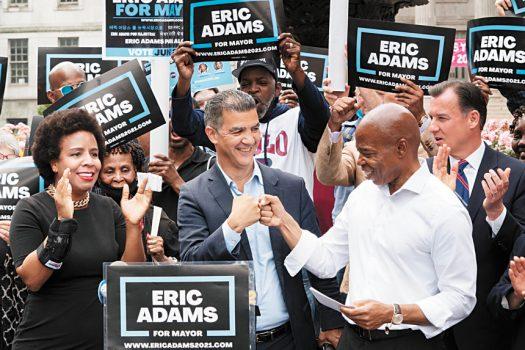 羅德里格斯(中)為市長亞當斯的長期政治盟友。James Estrin/紐約時報