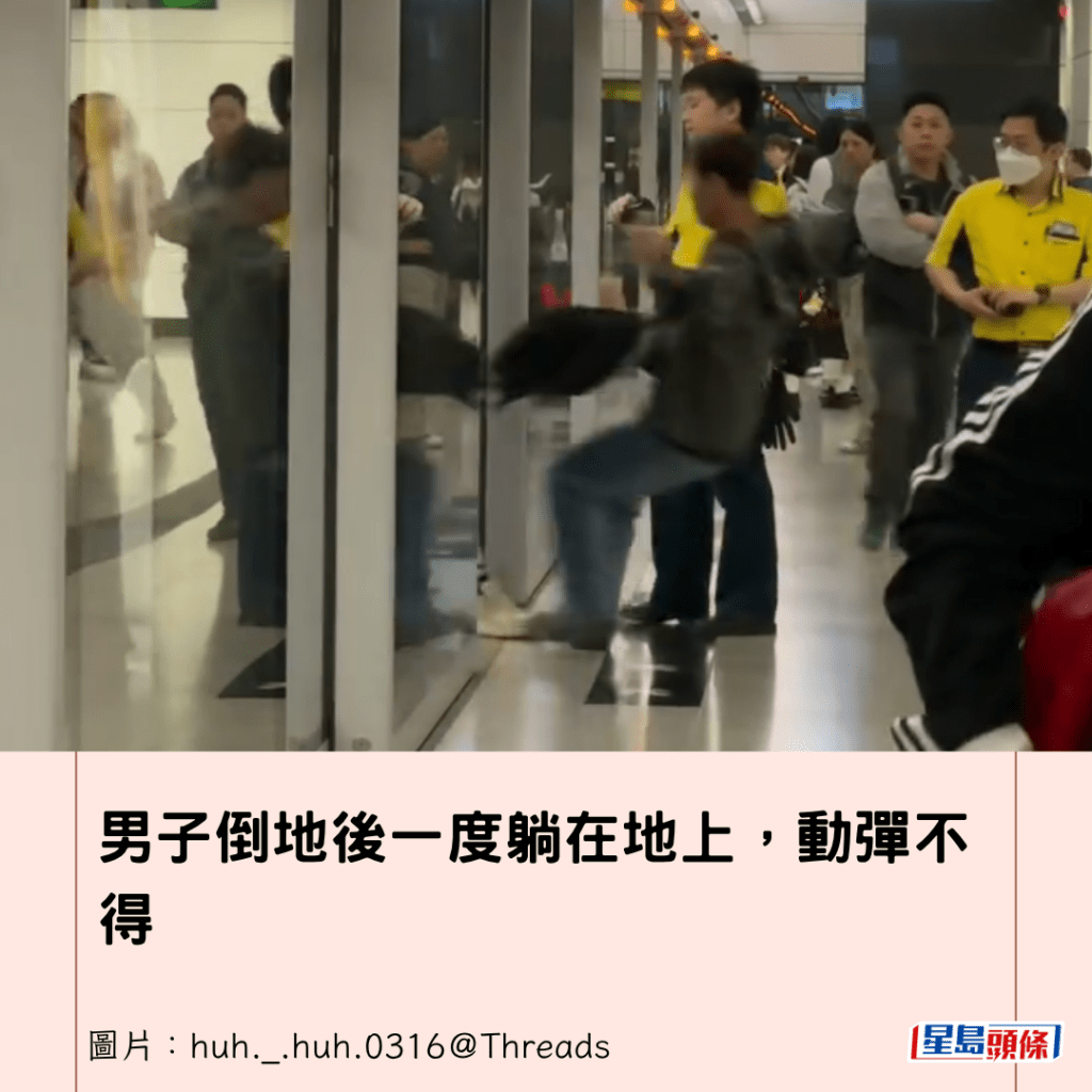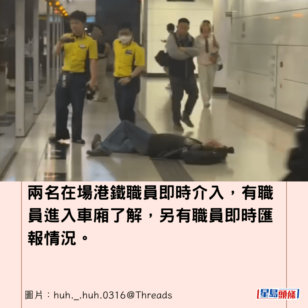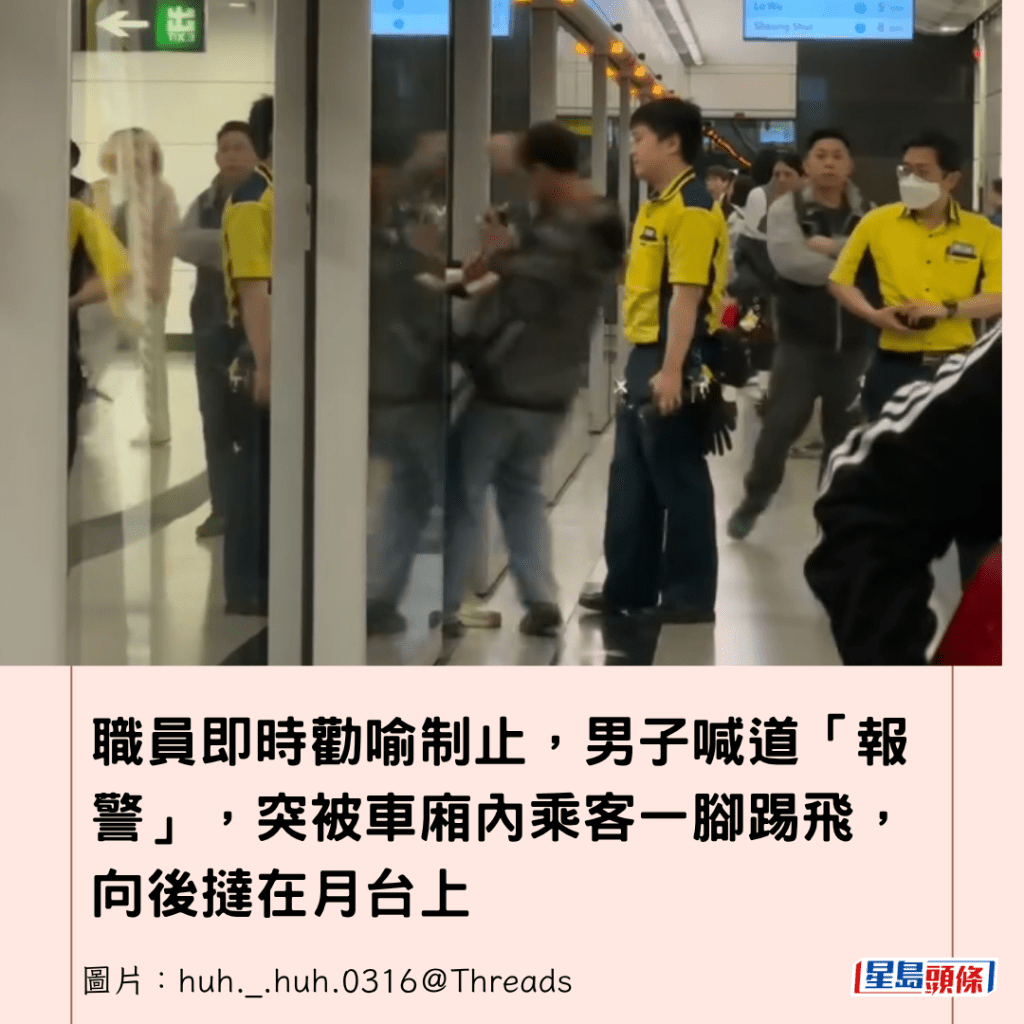 職員即時勸喻制止,男子喊道「報警」,突被車廂內乘客一腳踢飛,向後撻在月台上,男子倒地後一度躺在地上,動彈不得,其後半躺著爆粗指罵車廂內乘客,兩名在場港鐵職員即時介入,有職員進入車廂了解,另有職員即時匯報情況。