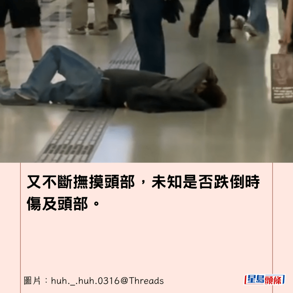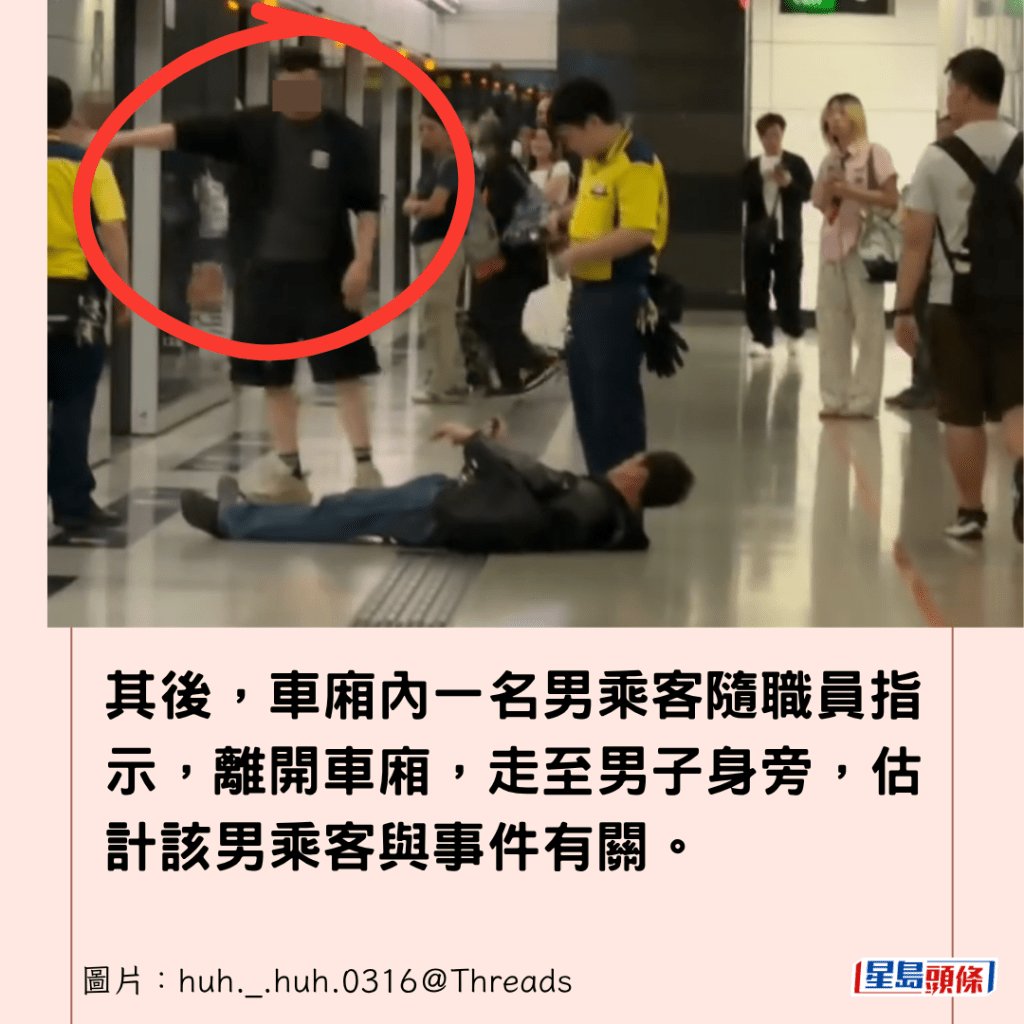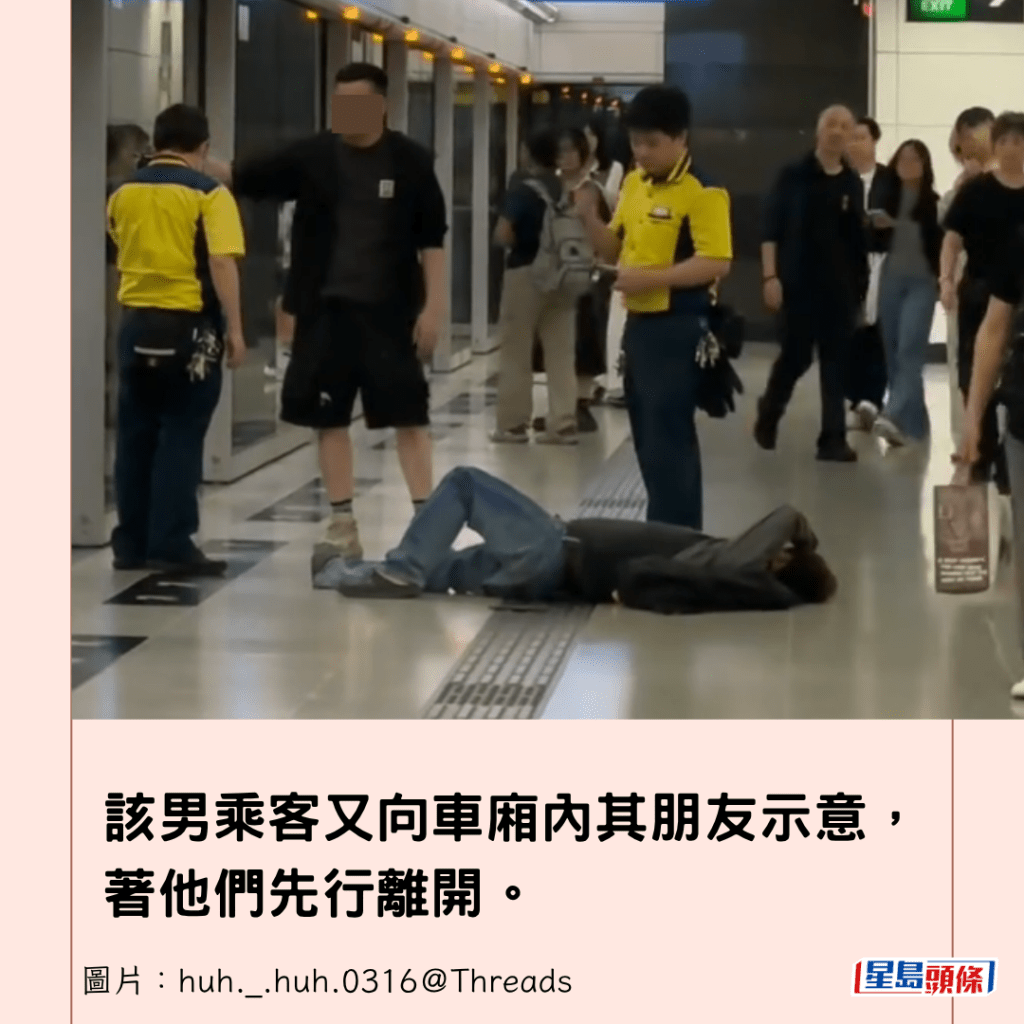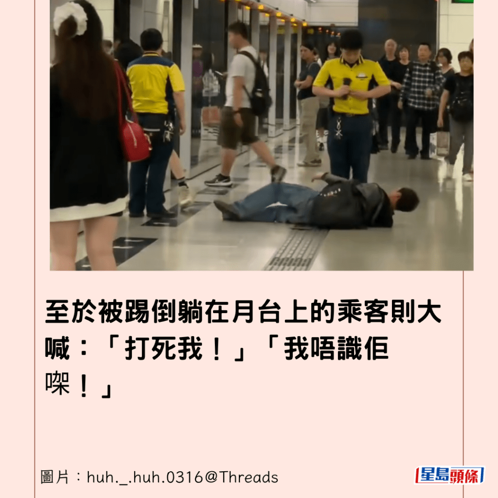 車廂內其後再有乘客欲走出來,但被該男乘客推回車廂內,該男乘客又向車廂內其朋友示意,著他們先行離開。至於被踢倒躺在月台上的乘客則大喊:「打死我!」「我唔識佢㗎!」又不斷撫摸頭部,未知是否跌倒時傷及頭部。
