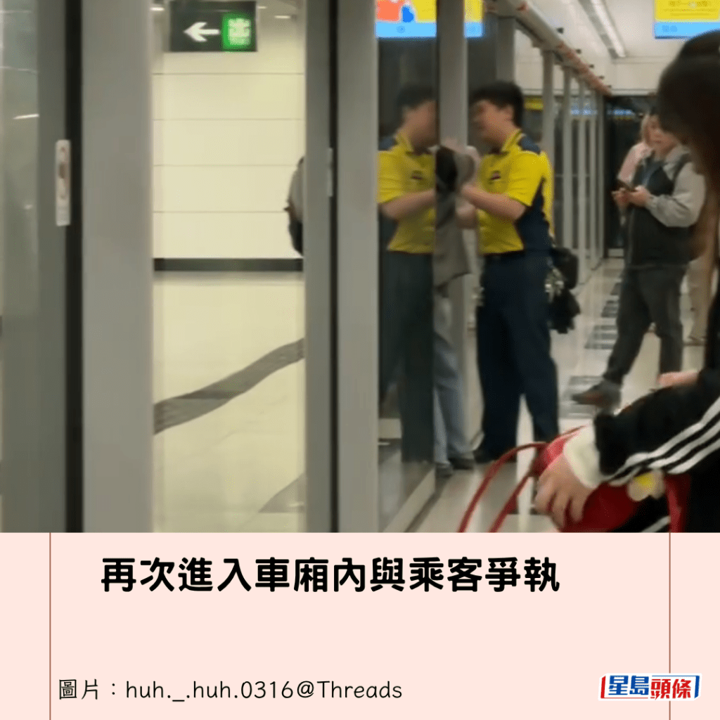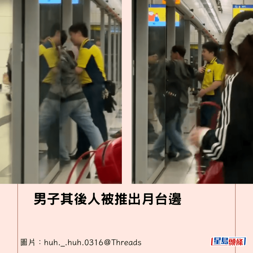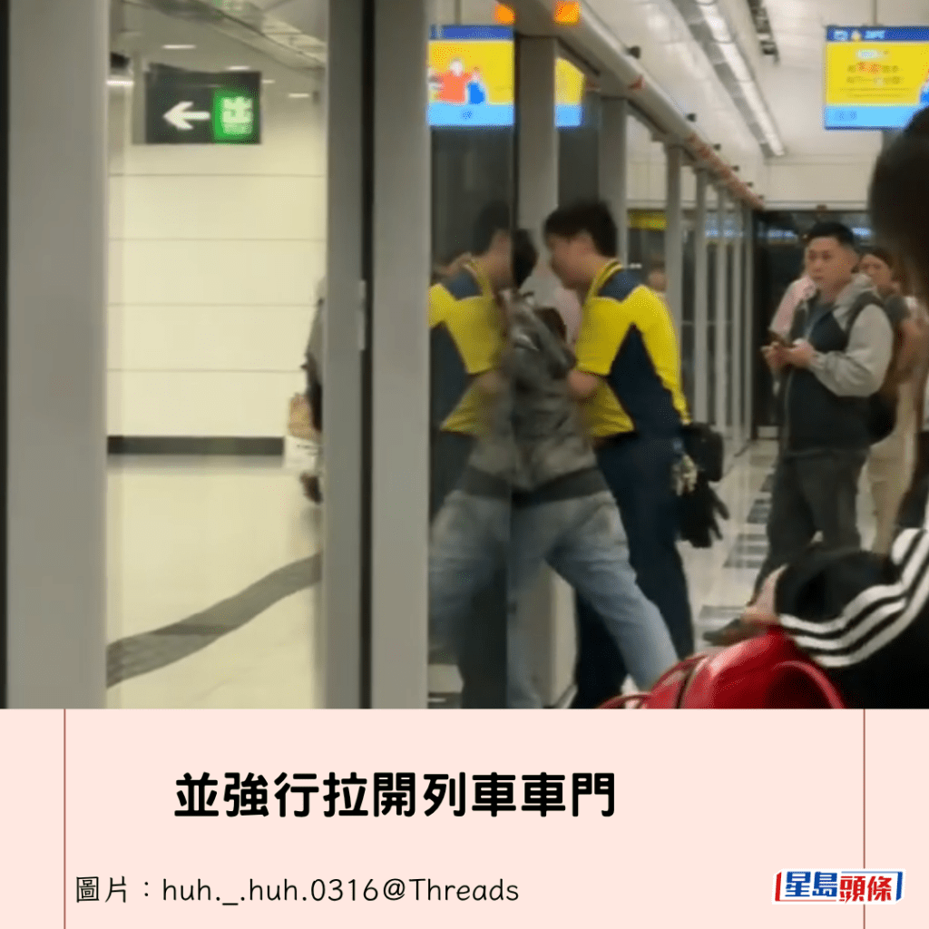 男子其後人被推出月台邊,他向職員投訴說:「佢打人!」這時列車車門關上,但該男子竟以手擋門,並強行拉開列車車門,再次進入車廂內與乘客爭執。