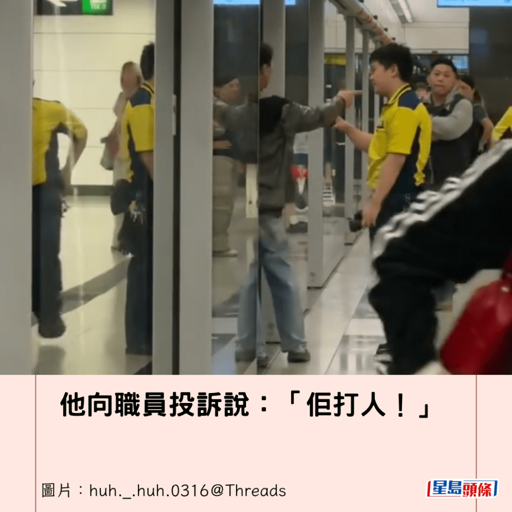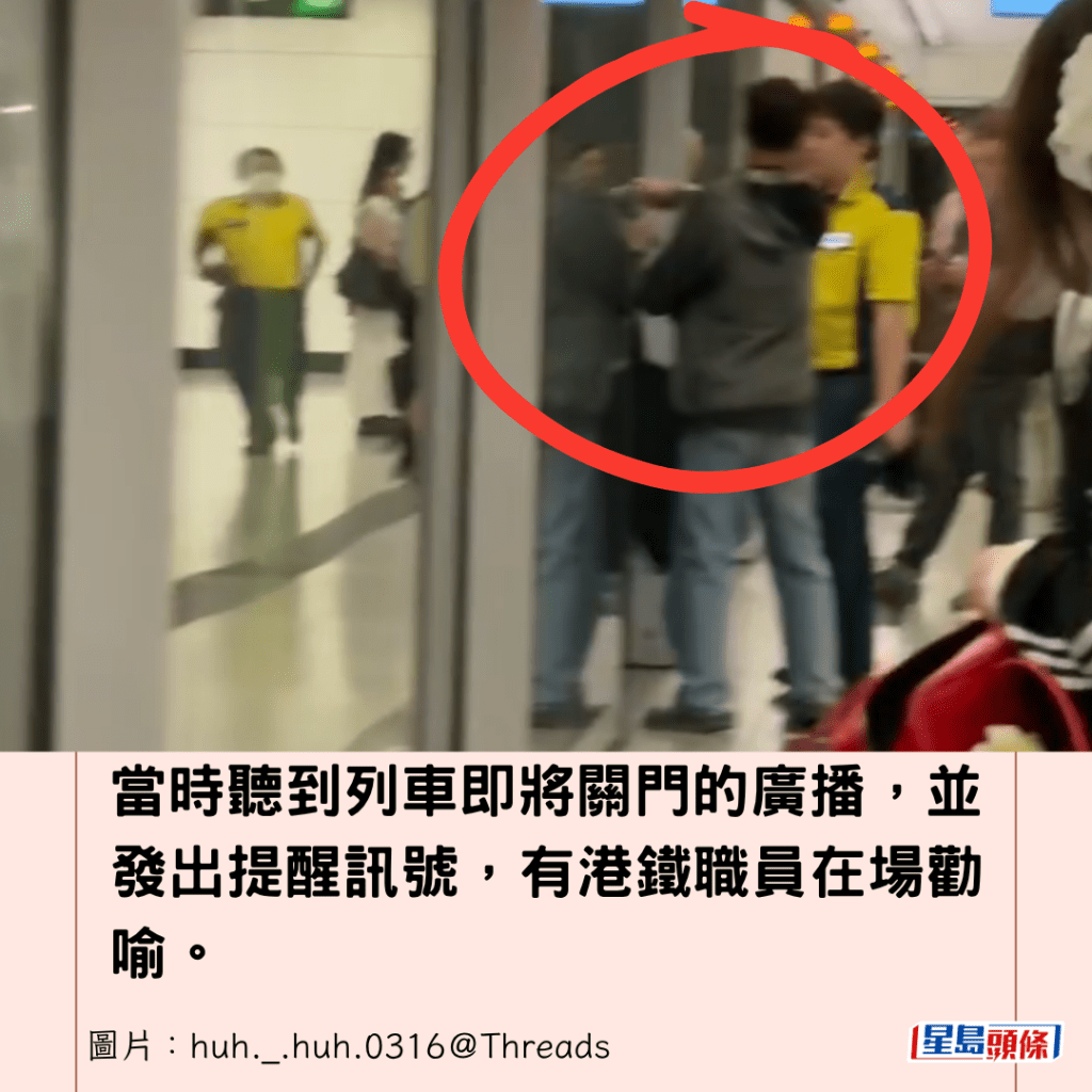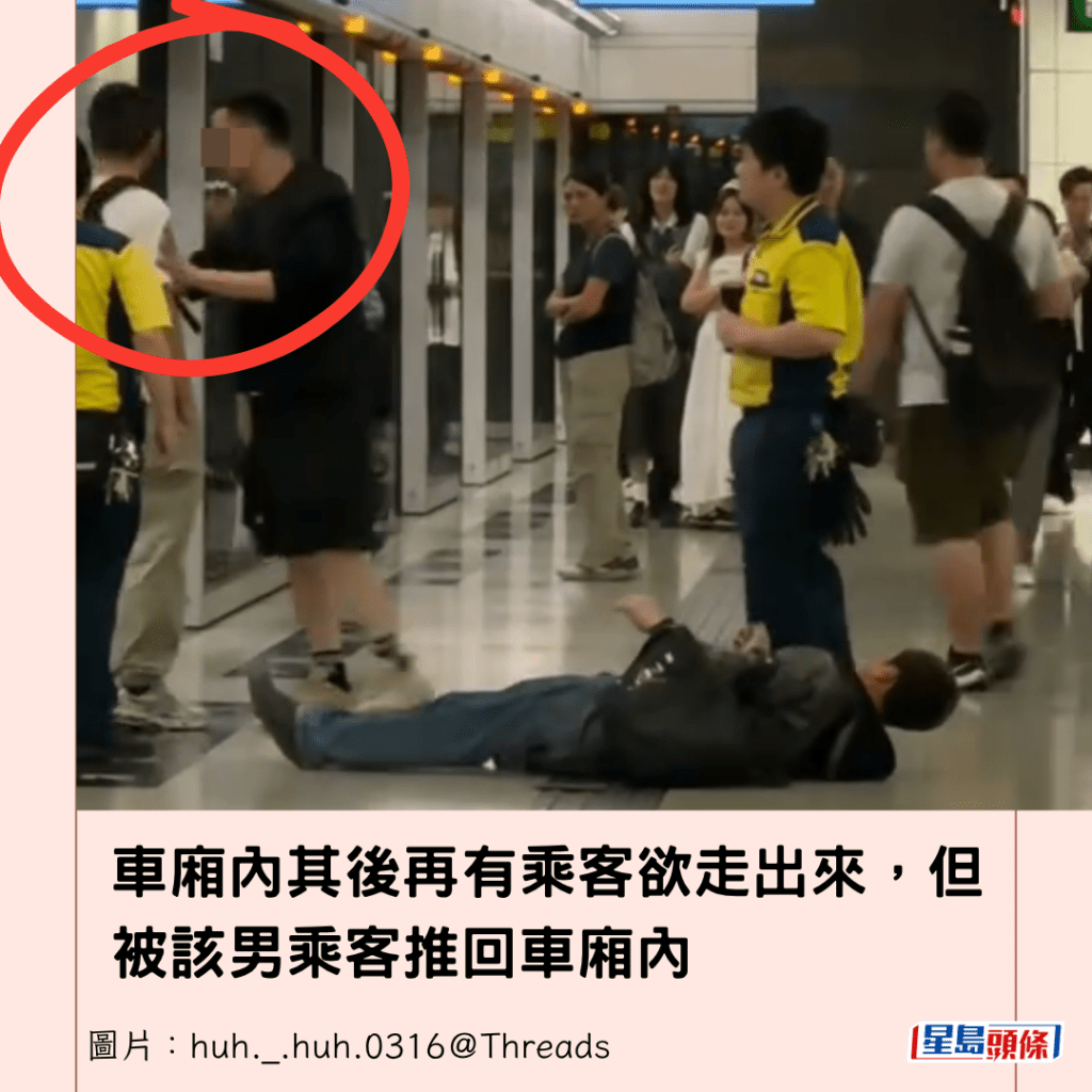 男子其後人被推出月台邊,他向職員投訴說:「佢打人!」這時列車車門關上,但該男子竟以手擋門,並強行拉開列車車門,再次進入車廂內與乘客爭執。