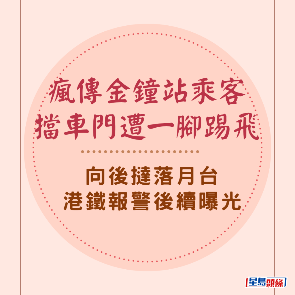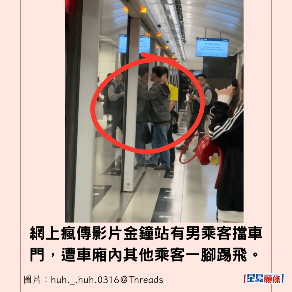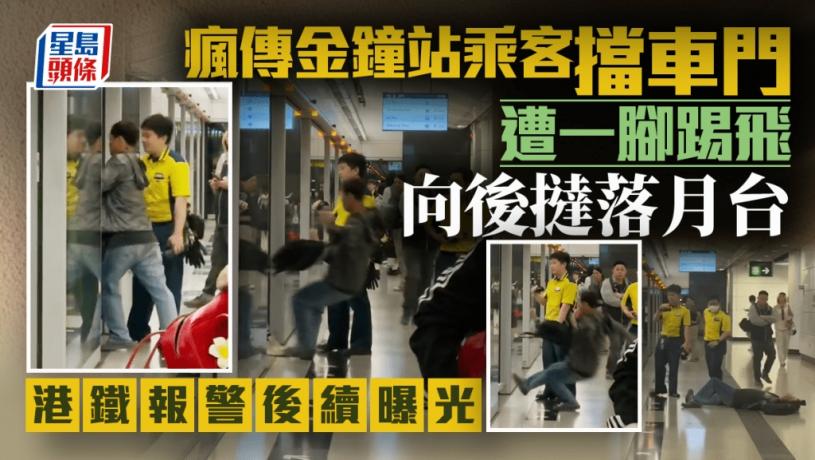 網上瘋傳影片金鐘站有男乘客擋車門,遭車廂內其他乘客一腳踢飛,向後撻落月台,事發時有港鐵職員在場,港鐵其後報警。