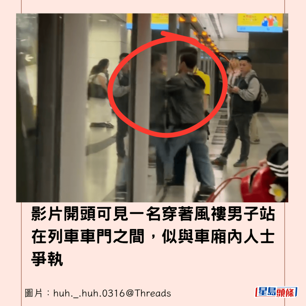 影片開頭可見一名穿著風褸男子站在列車車門之間,似與車廂內人士爭執,當時聽到列車即將關門的廣播,並發出提醒訊號,有港鐵職員在場勸喻。