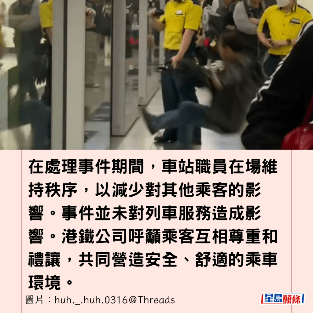 發言人又謂,在處理事件期間,車站職員在場維持秩序,以減少對其他乘客的影響。事件並未對列車服務造成影響。港鐵公司呼籲乘客互相尊重和禮讓,共同營造安全、舒適的乘車環境。