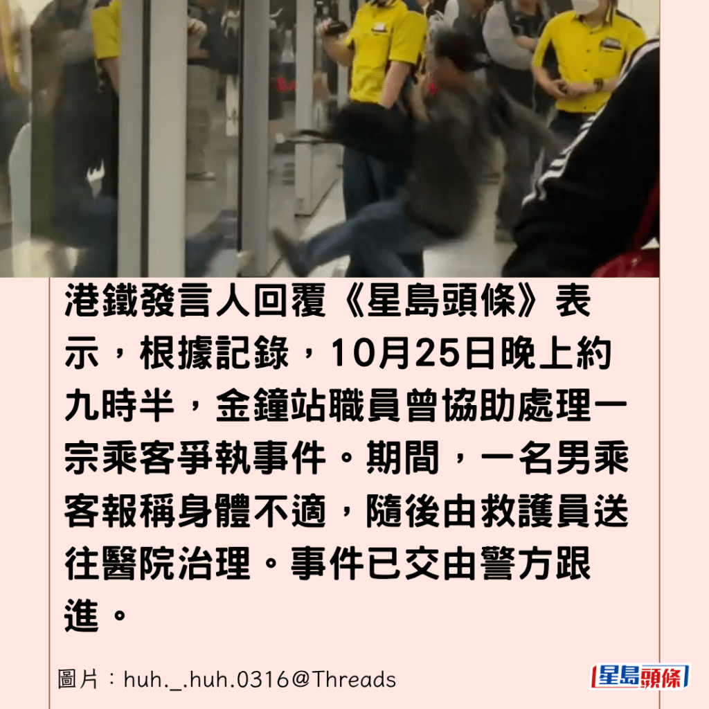 港鐵發言人回覆《星島頭條》表示,根據記錄,10月25日晚上約九時半,金鐘站職員曾協助處理一宗乘客爭執事件。期間,一名男乘客報稱身體不適,隨後由救護員送往醫院治理。事件已交由警方跟進。