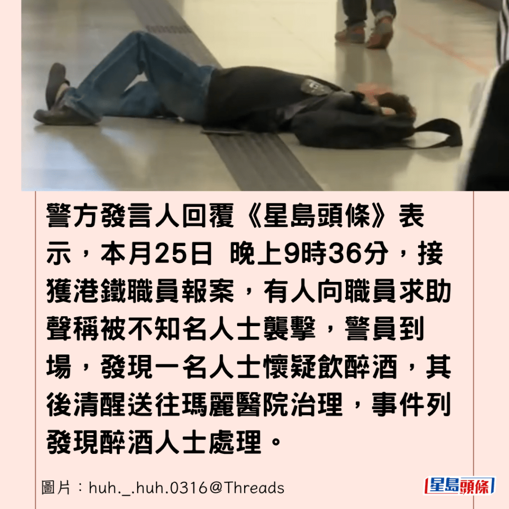 警方發言人回覆《星島頭條》表示,本月25日 晚上9時36分,接獲港鐵職員報案,有人向職員求助聲稱被不知名人士襲擊,警員到場,發現一名人士懷疑飲醉酒,其後清醒送往瑪麗醫院治理,事件列發現醉酒人士處理。