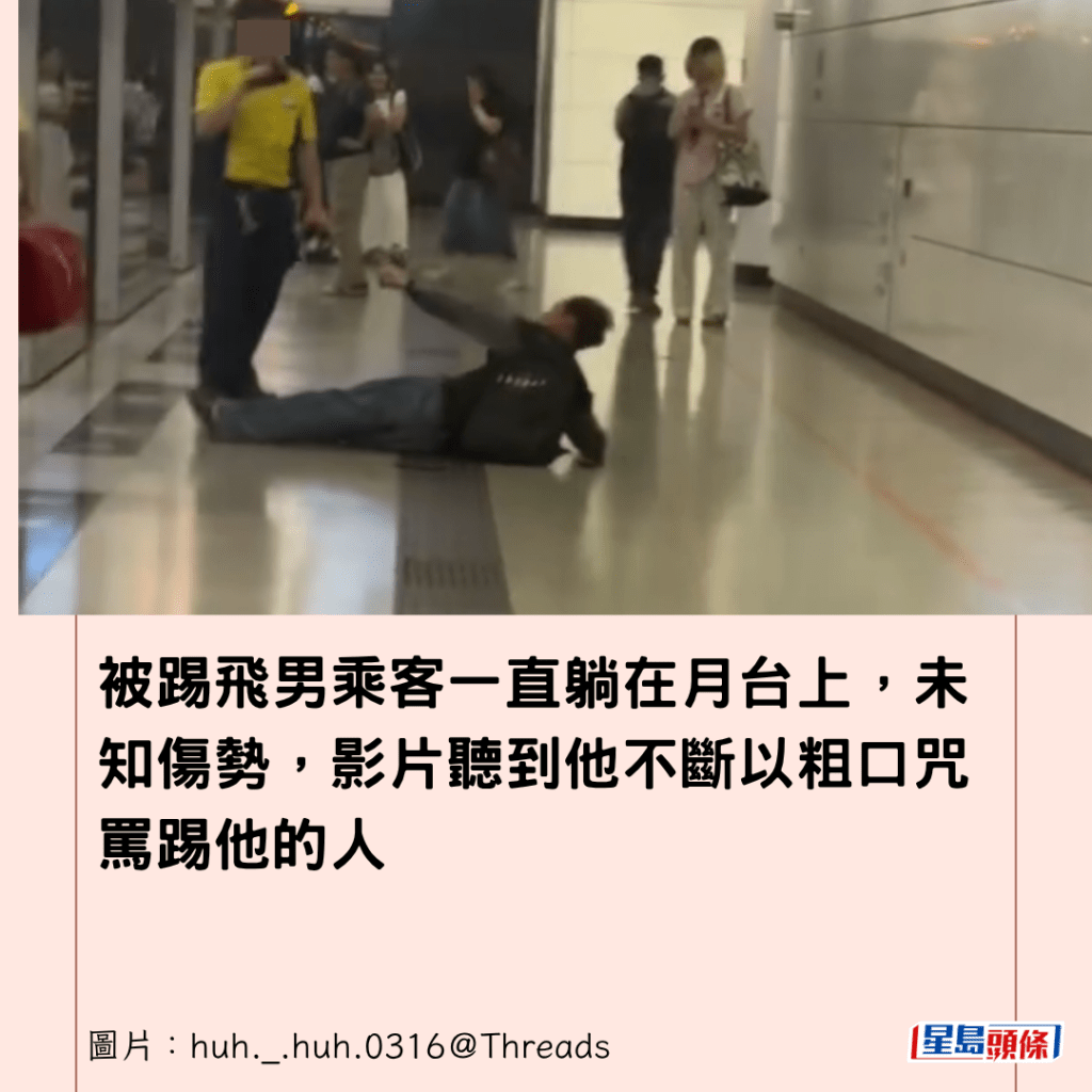 被踢飛男乘客一直躺在月台上,未知傷勢,影片聽到他不斷以粗口咒罵踢他的人,其後,車廂內一名男乘客隨職員指示,離開車廂,走至男子身旁,估計該男乘客與事件有關。