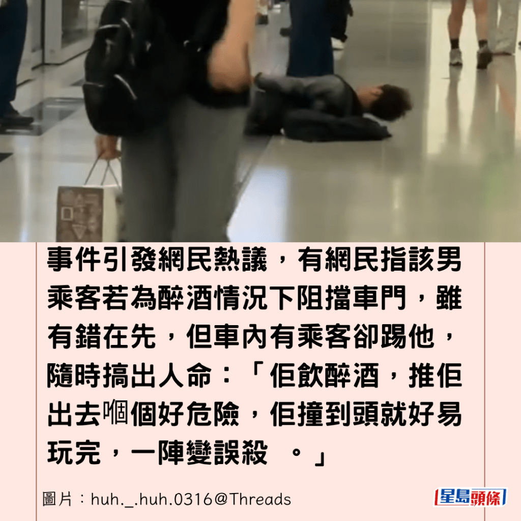 事件引發網民熱議,有網民指該男乘客若為醉酒情況下阻擋車門,雖有錯在先,但車內有乘客卻踢他,隨時搞出人命:「佢飲醉酒,推佢出去嗰個好危險,佢撞到頭就好易玩完,一陣變誤殺 。」