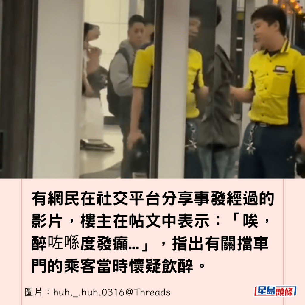 有網民在社交平台分享事發經過的影片,樓主在帖文中表示:「唉,醉咗喺度發癲…」,指出有關擋車門的乘客當時懷疑飲醉。