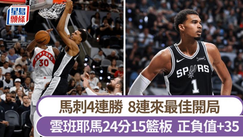 馬刺在周一NBA主場以121:103擊敗速龍,開季豪取4連勝,是球隊自2017年以來首次於開局4戰全勝。該隊的「法國怪物」雲班耶馬(Victor Wembanyama)如首3場般,再次交出統治性的演出,全場8投7中,加上10個罰球全部命中,取得24分15籃板,正負值高達+35,出場31分鐘就解決比賽。