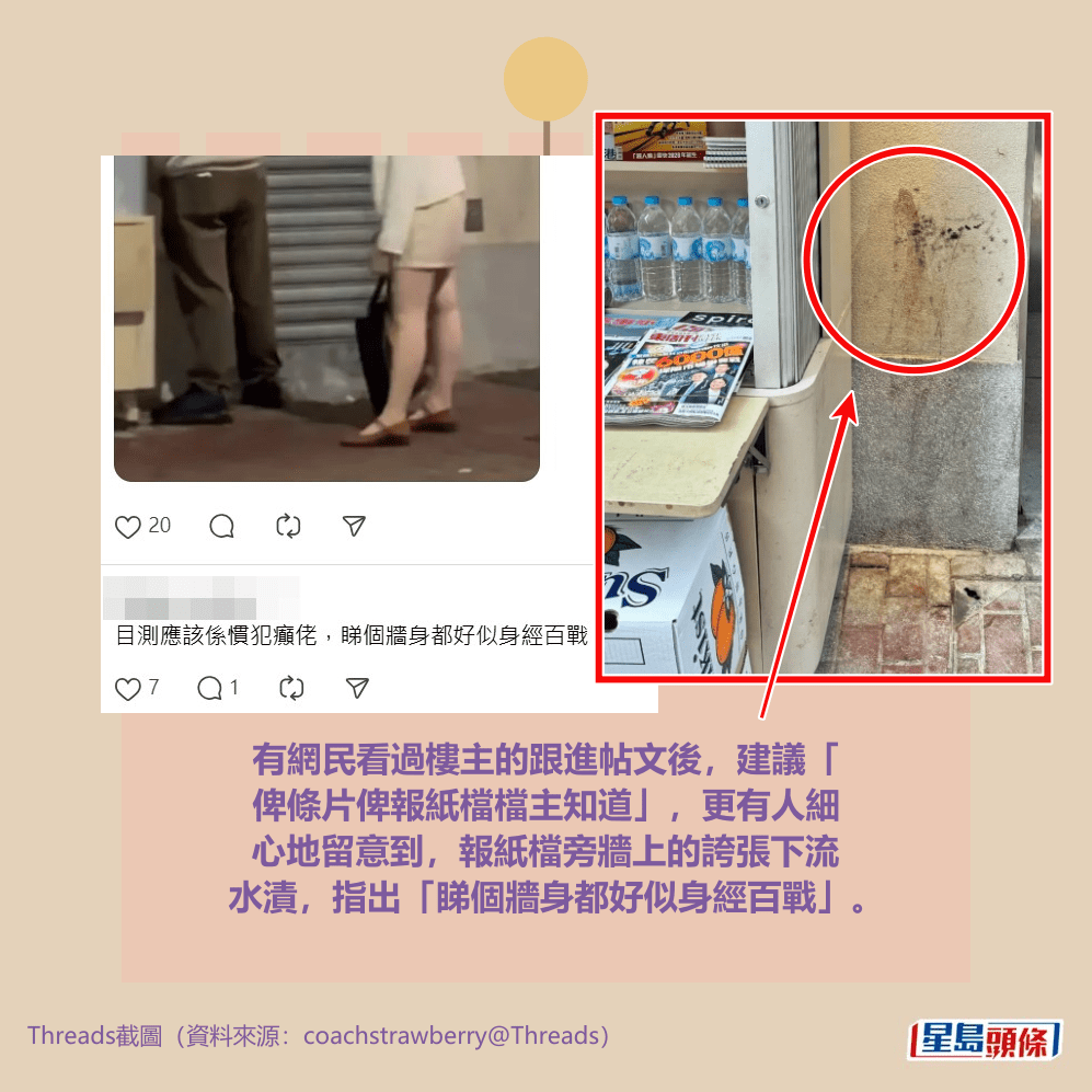 有網民看過樓主的跟進帖文後,建議「俾條片俾報紙檔檔主知道」,更有人細心地留意到,報紙檔旁牆上的誇張下流水漬,指出「睇個牆身都好似身經百戰」。