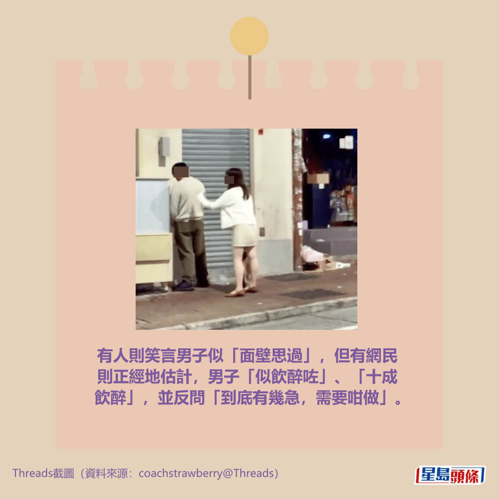 有人認為男子的做法「好核突,X間鋪多得佢唔少 」、「喺舖頭門前,好無道義」,於是有網民建議樓主「Send(傳)返去俾間舖頭,等佢哋貼大字報尋人」。有人則笑言男子似「面壁思過」,但有網民則正經地估計,男子「似飲醉咗」、「十成飲醉」,並反問「到底有幾急,需要咁做」。