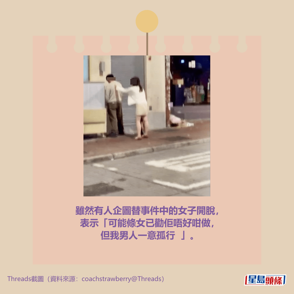 雖然有人企圖替事件中的女子開脫,表示「可能條女已勸佢唔好咁做,但我男人一意孤行 」,但樓主回覆時強調,「絕對唔係呀,個女下1秒已經XX我」、「反而係個男人知衰叫佢走」;樓主並感慨「大街(隨地小便)真係未見過」。