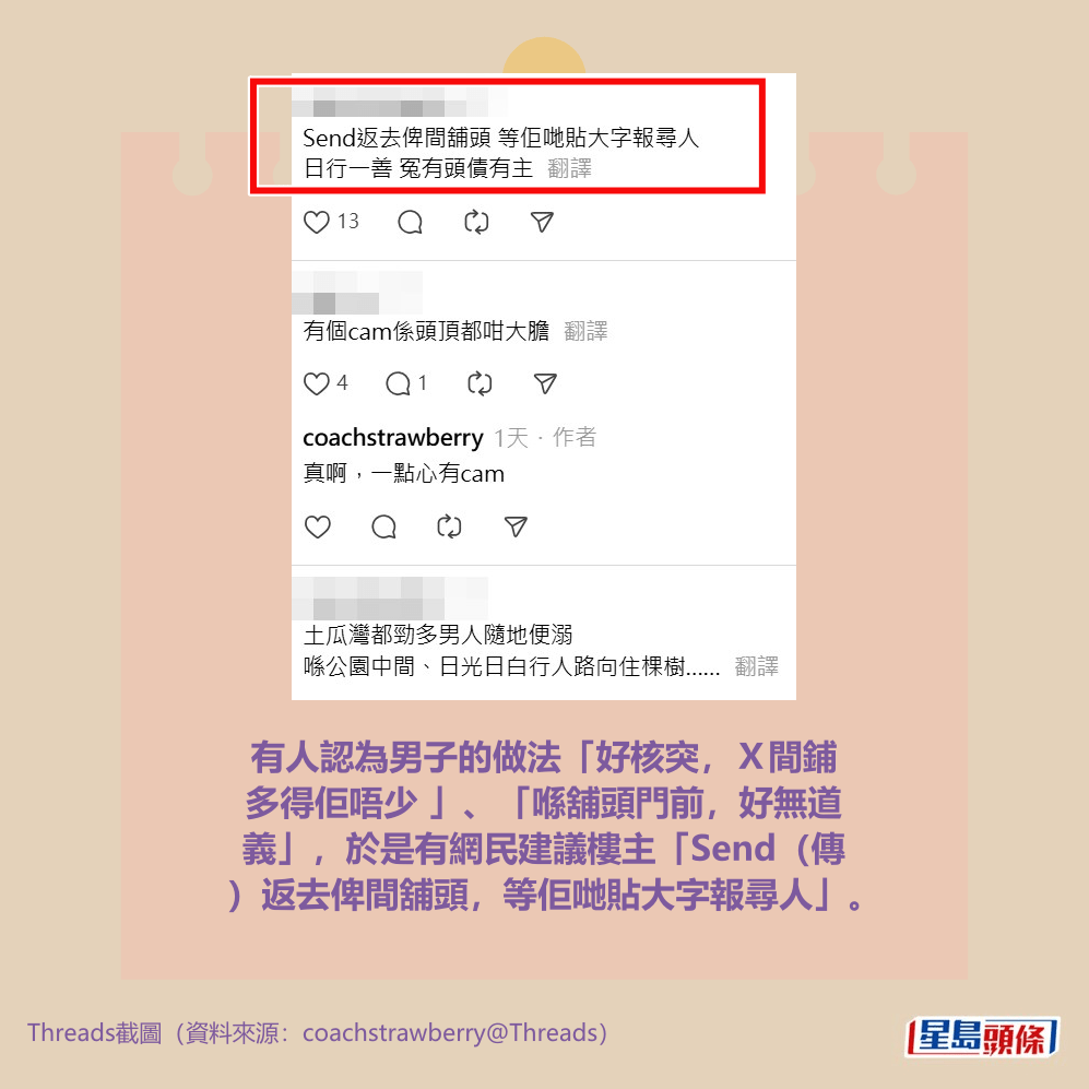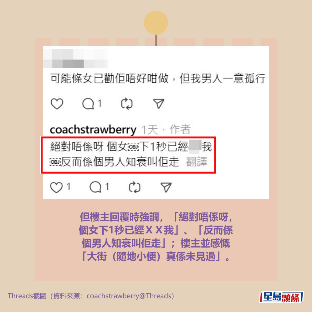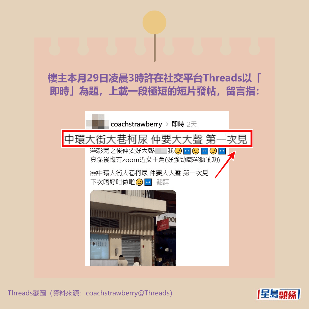 樓主本月29日凌晨3時許在社交平台Threads以「即時」為題,上載一段極短的短片發帖,留言指「影完之後仲要好大聲XX我。真係後悔冇zoom(拉埋)近女主角(好強勁嘅獅吼功)。中環大街大巷屙尿仲要大大聲第一次見,下次唔好咁做啦」。