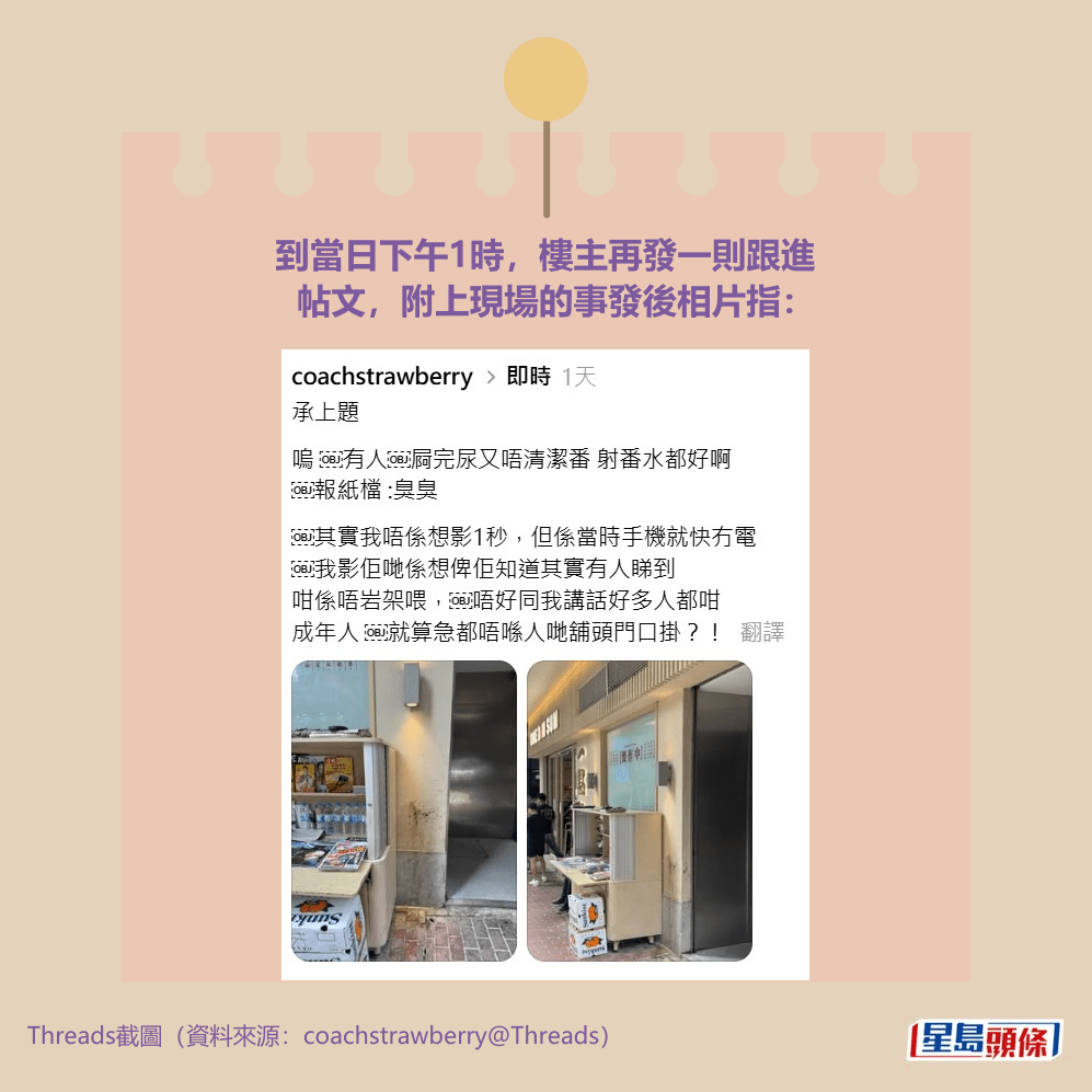 到當日下午1時,樓主再發一則跟進帖文,附上現場的事發後相片指「承上題,嗚,有人屙完尿又唔清潔番,射番水都好啊。報紙檔:臭臭。其實我唔係想影1秒,但係當時手機就快冇電,我影佢哋係想俾佢知道其實有人睇到,咁係唔啱㗎喂,唔好同我講話好多人都咁,成年人,就算急都唔喺人哋舖頭門口掛?!」。