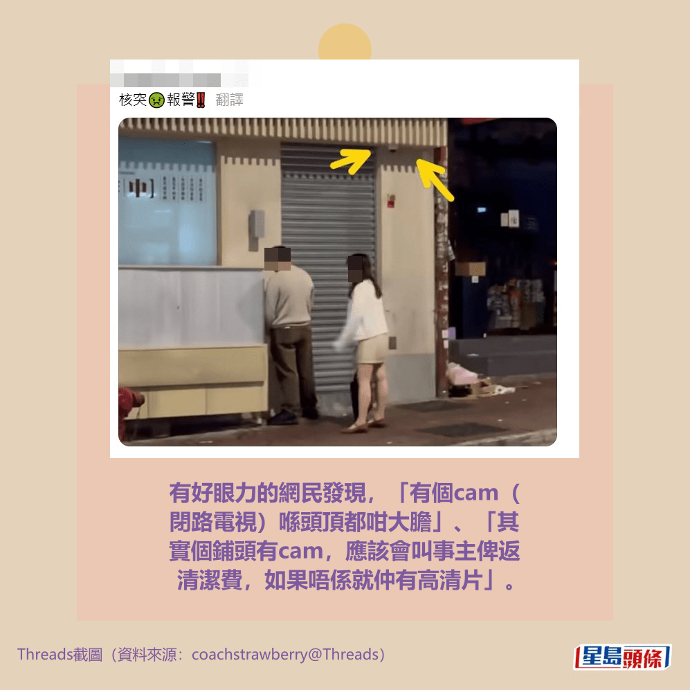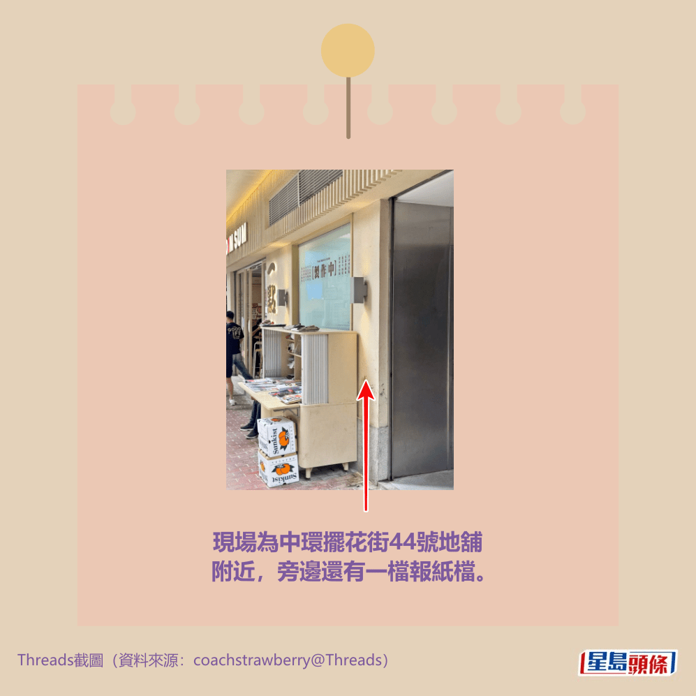 現場為中環擺花街44號地舖附近,旁邊還有一檔報紙檔。有好眼力的網民發現,「有個cam(閉路電視)喺頭頂都咁大膽」、「其實個鋪頭有cam,應該會叫事主俾返清潔費,如果唔係就仲有高清片」。