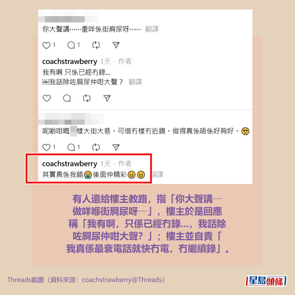 有人還給樓主教路,指「你大聲講⋯⋯做咩喺街屙尿呀⋯⋯」,樓主於是回應稱「我有啊,只係已經冇錄…,我話除咗屙尿仲咁大聲?」;樓主並自責「我真係最衰電話就快冇電,冇繼續錄」。