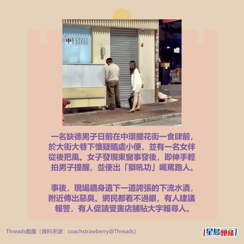 一名缺德男子日前在中環擺花街一食肆前,於大街大巷下懷疑隨處小便,並有一名女伴從後把風。女子發現東窗事發後,即伸手輕拍男子提醒,並使出「獅吼功」喝罵路人。