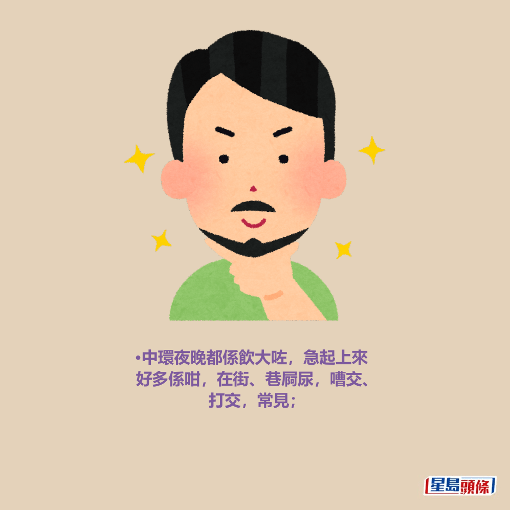 •中環夜晚都係飲大咗,急起上來好多係咁,在街、巷屙尿,嘈交、打交,常見;