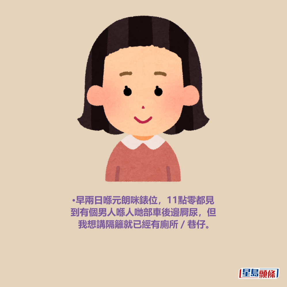 •早兩日喺元朗咪錶位,11點零都見到有個男人喺人哋部車後邊屙尿,但我想講隔籬就已經有廁所/巷仔。