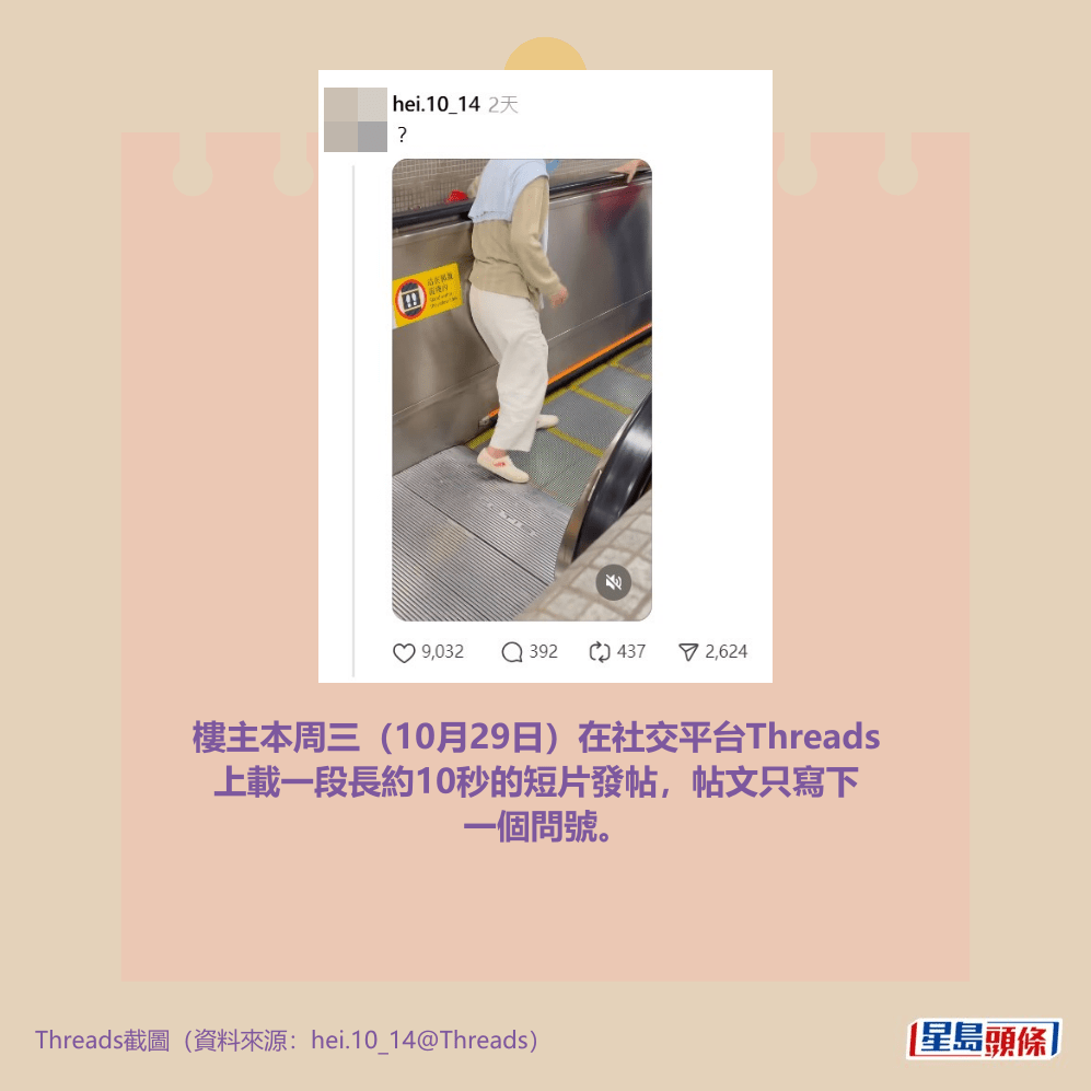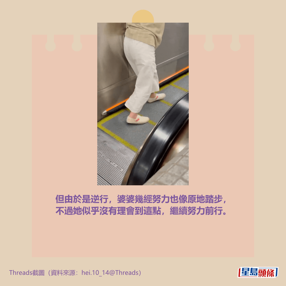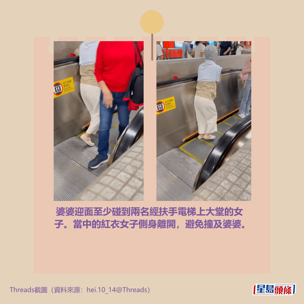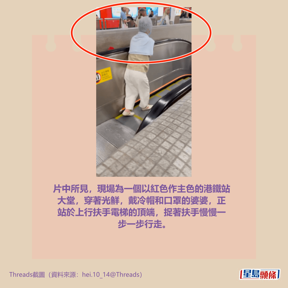 樓主本周三(10月29日)在社交平台Threads上載一段長約10秒的短片發帖,帖文只寫下一個問號。片中所見,現場為一個以紅色作主色的港鐵站大堂,穿著光鮮,戴冷帽和口罩的婆婆,正站於上行扶手電梯的頂端,捉著扶手慢慢一步一步行走。