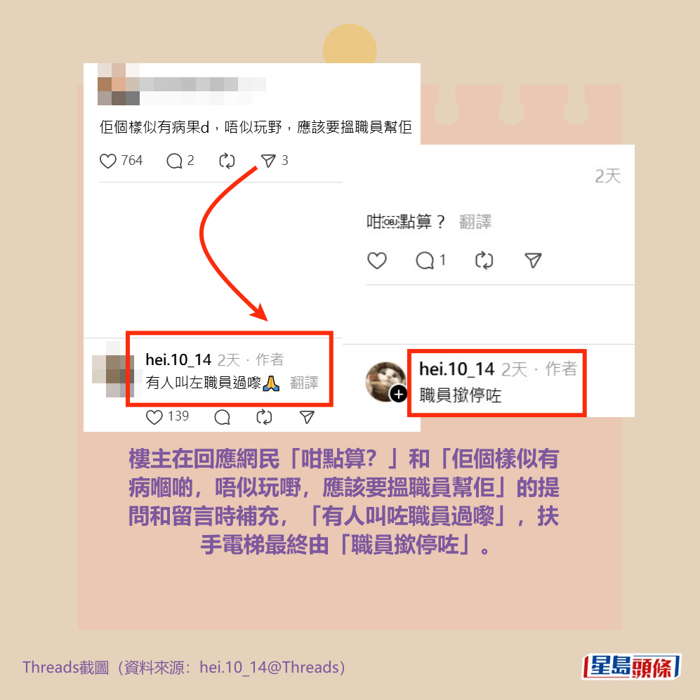 樓主在回應網民「咁點算?」和「佢個樣似有病嗰啲,唔似玩嘢,應該要搵職員幫佢」的提問和留言時補充,「有人叫咗職員過嚟」,扶手電梯最終由「職員撳停咗」。